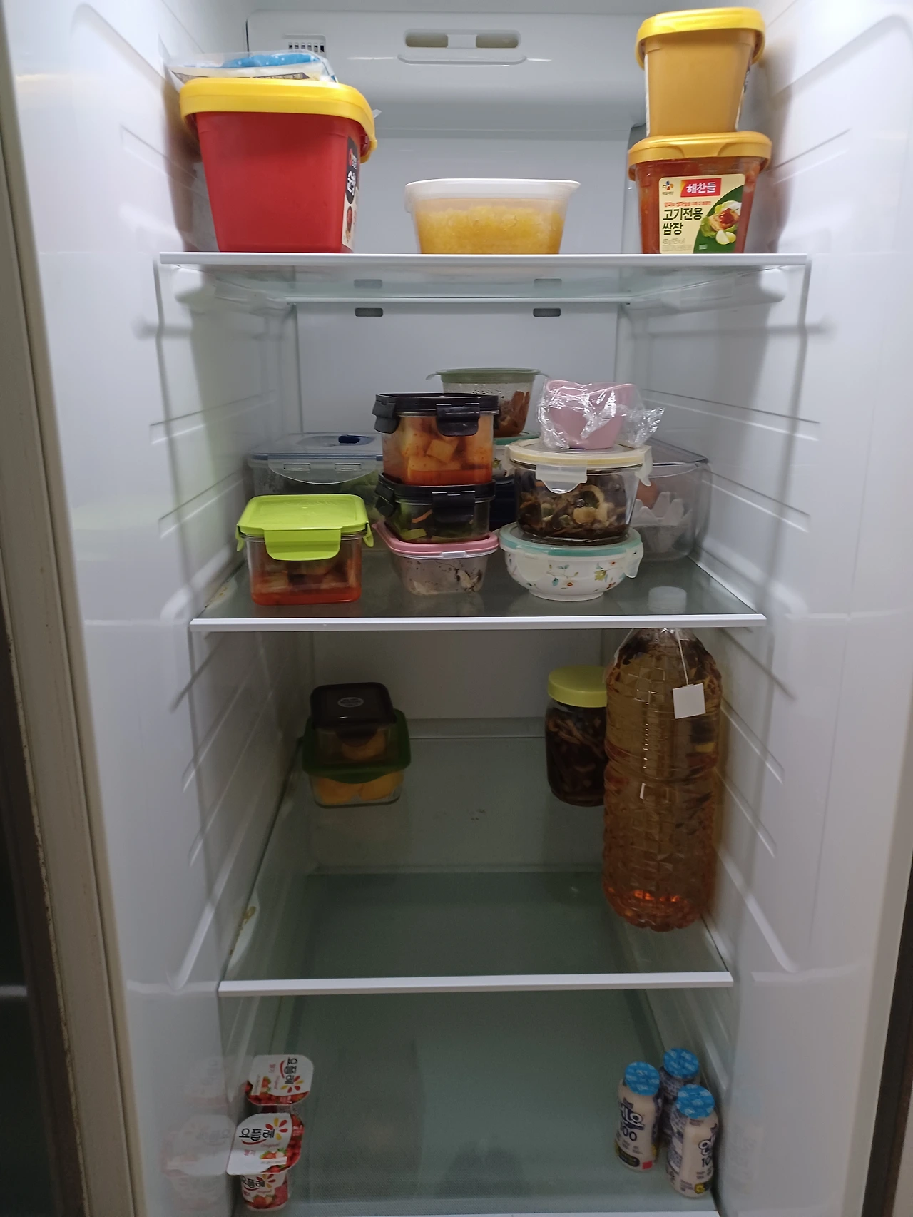냉장고가 가득 찼다가 장보기 전날 홀쭉해지는 모습을 매주 보는 기쁨이 있습니다. 냉장고 안에는 딱 이번 한 주 해먹을 식재료만 있을 때가 가장 집밥 해 먹기 마음을 불러일으켜줍니다.