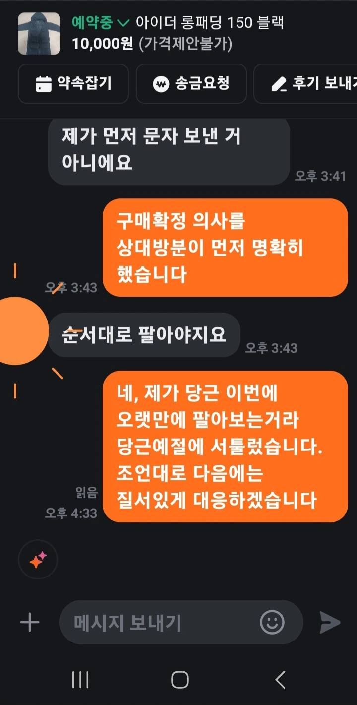 아~그리고 첫 거래에서부터 다른 구매희망자에게 컴플레인을 받았습니다. 새해가 이제 갓 시작했는데 처음으로 받은 지적입니다. 그냥 지나갈까 하다 나를 위해, 그리고 기분 상했을 상대방을 배려하며 예의를 갖춰 반응했습니다. 당근만의 규칙이 있구나, 아직 난 새내기구나 생각이 들었습니다.