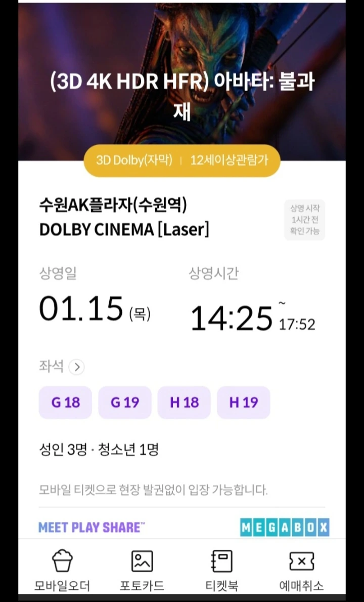 교사여서 교직원 공제회 영화할인쿠폰을 이용할 수 있는 일반관 2D로 예매할까 잠시 고민했지만, 관람 후기를 읽고 종합해 본 결과 3시간 30분을 몰입해서 보기에는 3D다 싶었습니다. 수원 AK플라자 메가박스에서 가장 맞는 시간대를 골라 DOLBY CINEMA로 할인 없이 성인 3명, 청소년 1명 구매하니 89,000원이었어요.