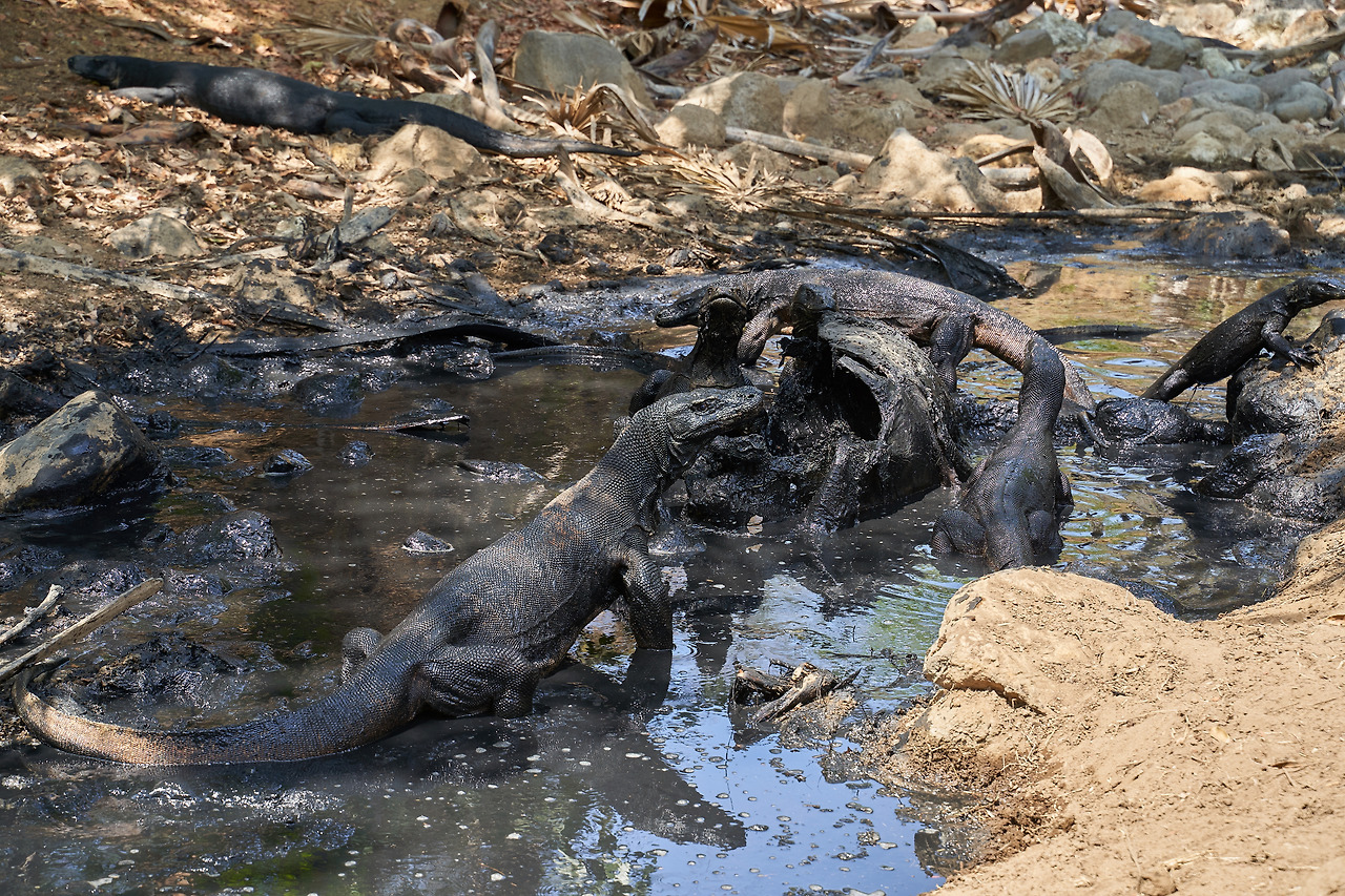 이틀 전 사냥당한 물소 한 마리를 둘러싸고 코모도 드래곤 무리가 식사를 하고 있는 모습이었다. 레인저를 바짝 쫓아 서서히 거리를 좁혀 갔다. 까만색 머드를 뒤집어쓴 채 게걸스럽게 식사하는 모 습을 보고 있자니 물소의 사체에서 나오는 악취마저 망각할 정도였다.