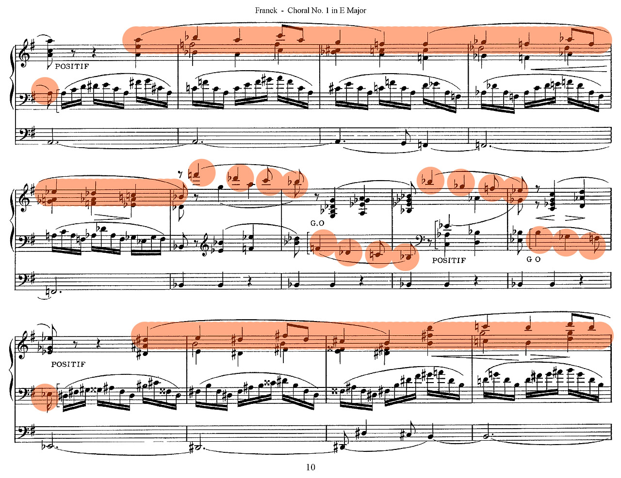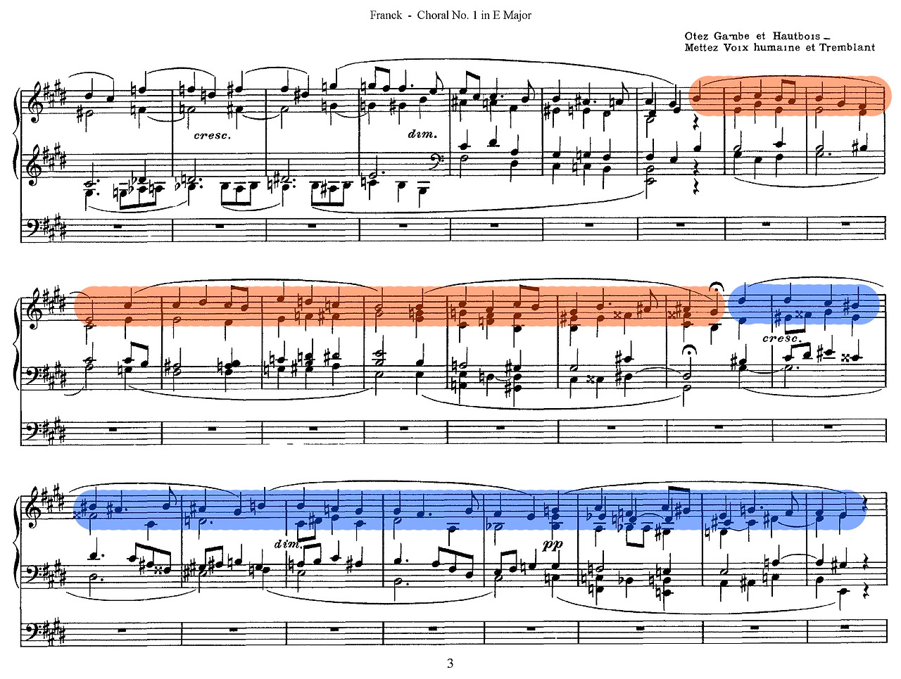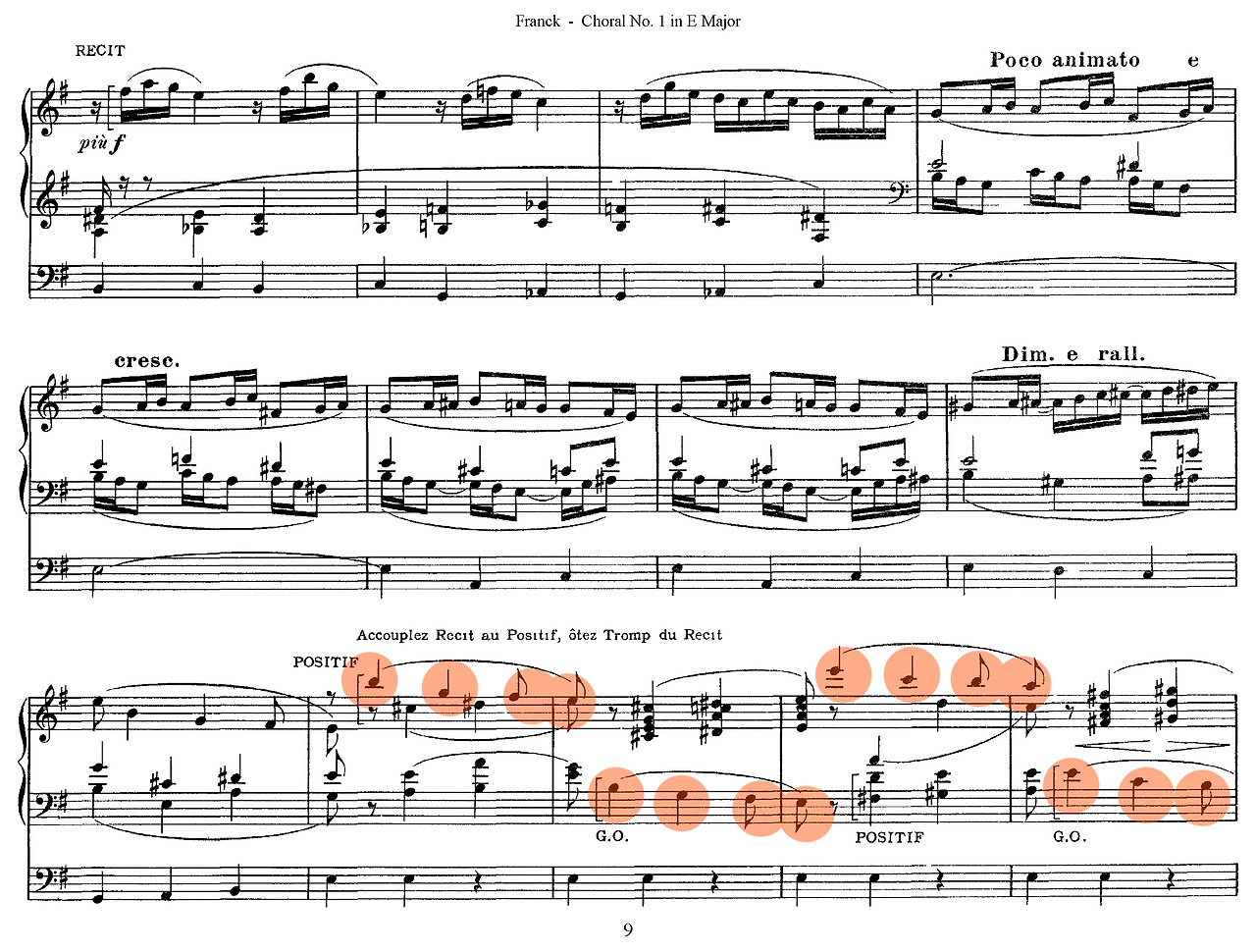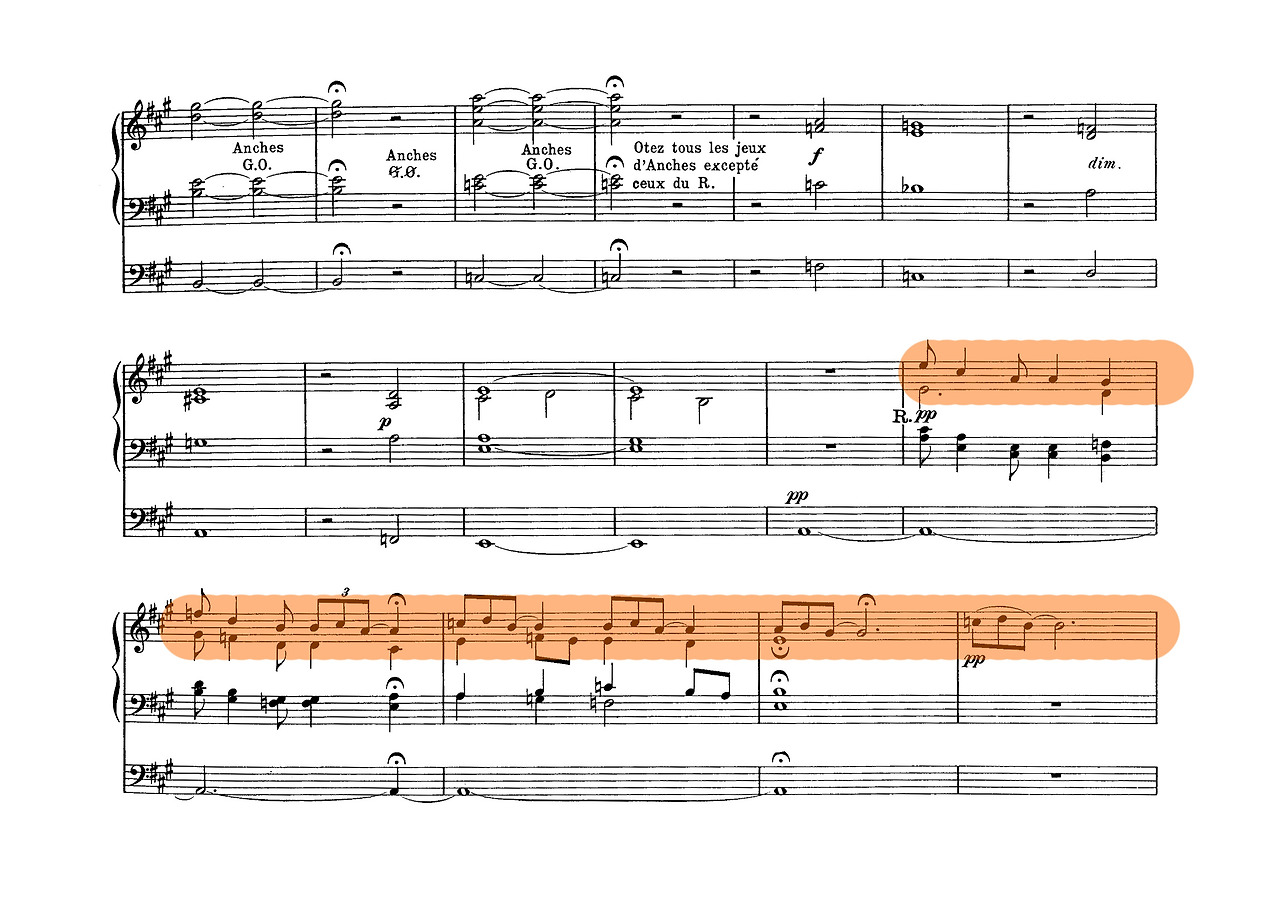 셋째, 구조적 통일성이다. 프랑크는 바흐식 대위법에 반음계적 화성과 순환 형식을 접목해 핵심 모티프가 곡 전체를 관통하도록 구성했다. 《세 개의 코랄》(Trois Chorals, 1890)에서 점층적 전개와 모티프 변형을 통해 오르간 음악은 단편적 연주에서 벗어나 대규모 서사적 장르로 발전했다. 이러한 기법은 후대 비도르(Charles-Marie Widor)와 비에른(Louis Vierne)이 프랑스 교향적 오르간 전통을 확립하는 기반이 되었다.