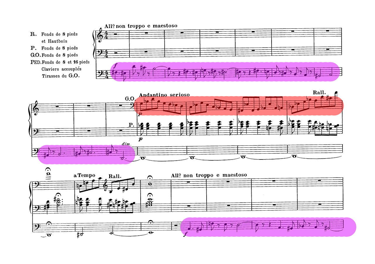 ‘교향적’이라는 표현은 프랑크 음악에서 구체적 의미를 갖는다. 단순히 오케스트라의 음색을 모방하는 것이 아니라, 음색, 화성, 형식을 통합해 장대한 구조를 설계하는 능력을 뜻한다. 프랑크는 카바이유-콜 오르간의 다양한 스톱과 잔향 효과를 활용해, 한 명의 연주자가 성당이라는 공간 속에서 전체 오케스트라 역할을 수행하도록 했다. 악장과 모티프는 서로 유기적으로 연결되며, 점층적 클라이맥스를 통해 청중은 음악적 서사의 흐름을 직관적으로 경험한다. 오르간은 단순 악기가 아니라, 공간과 시간, 화성적 긴장과 해소를 조율하는 거대한 서사적 구조체가 된다. 따라서 교향적이라는 수식어는 외형적 규모가 아닌, 음악적, 형식적 통합과 공간적, 서사적 사고를 포함한다.
