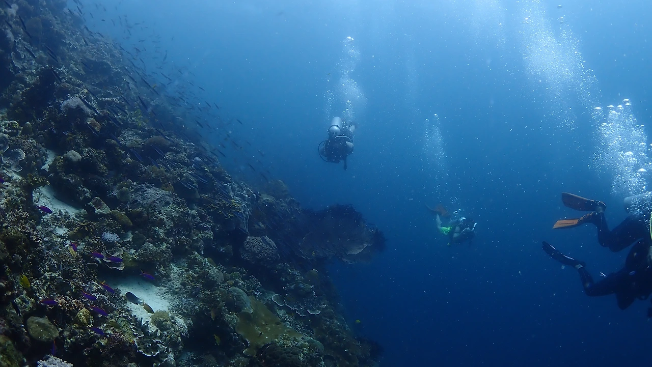 다이빙은 본래 버디와 함께하는 단체 활동이다. 특히 블루홀 같은 명소는 앞뒤로 늘어선 다이버들의 핀(오리발) 소동과 가이드들의 쉴 새 없는 수신호, 사방에서 뿜어져 나오는 기포들로 늘 북적거린다. 하지만 내가 그 심연에서 진정한 고립감을 느낀 것은 순전한 우연 덕분이었다. 순간적으로 무리와 뒤쳐져 서브 가이드와 단둘이 남게 된 찰나, 나를 어지럽히던 모든 시각적 소음이 마법처럼 증발했다. 타인의 존재가 지워진 자리에 비로소 심해의 고요함과 끝을 알 수 없는 풍경이 밀려들어 왔다. 규칙적인 내 숨소리와 레귤레이터를 빠져나가는 공기 방울의 소리만이 귓가에 울릴 때, 나는 비로소 우주 한복판에 홀로 떠 있음을 자각했다.