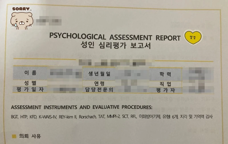 엄청난 양의 숙제를 받아오고 2주 뒤 검사를 예약했다. 최대한 숙제를 솔직하게 작성하고 2주 뒤 검사를 했다. 검사는 2시간 정도 소요되었다.