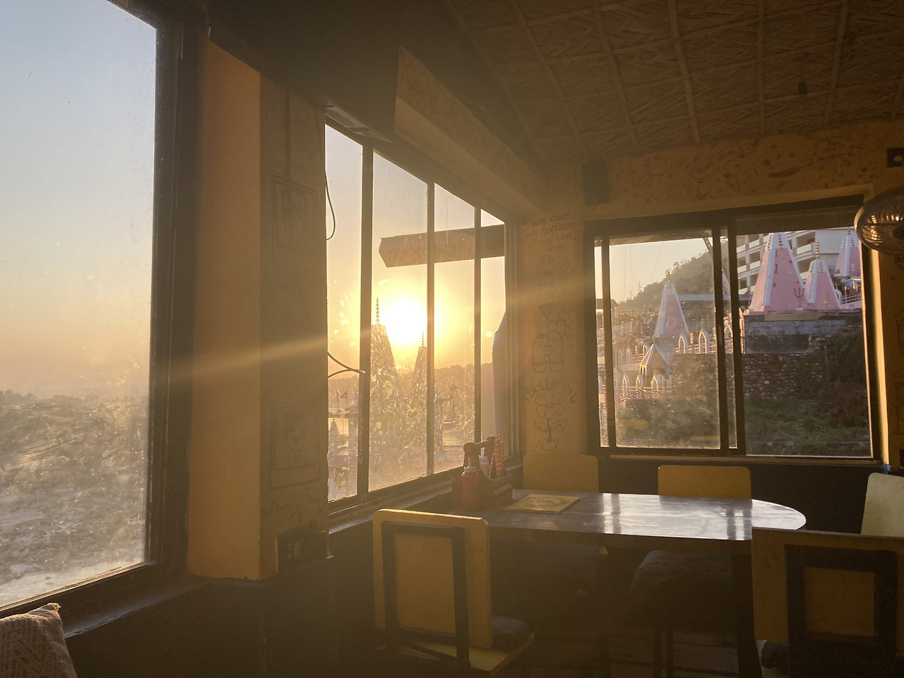 리시케시에서는 일을 하는 대신 낙서를 한다. 마음에 쏙 드는 카페를 발견하면 거의 그곳만 간다. 치앙마이에 이어 리시케시에서도 그런 카페를 발견했다. 낙서를 실컷 하기도 하고 아니면 여행에서 미리 해야 하는 일들을 한다(예를 들면 인도비자 신청하기, 인도철도청 가입하기 등). 카페에 있는 동안에는 내가 원하면 언제든지 밖을 바라볼 수 있다. 그리고 시간이 흐르는 것을 시계를 보지 않아도 느낄 수 있다. 해가 지면서 서서히 바뀌는 창문 밖 풍경을 즐긴다. 온도와 조도도 자연스럽게 바뀐다. 하루가 지나가고 있다는 것을 계속해서 느낄 수 있는 것이다. 이런 것을 느낄 수 있다는 것 자체가 너무 벅찰 정도로 좋다.
