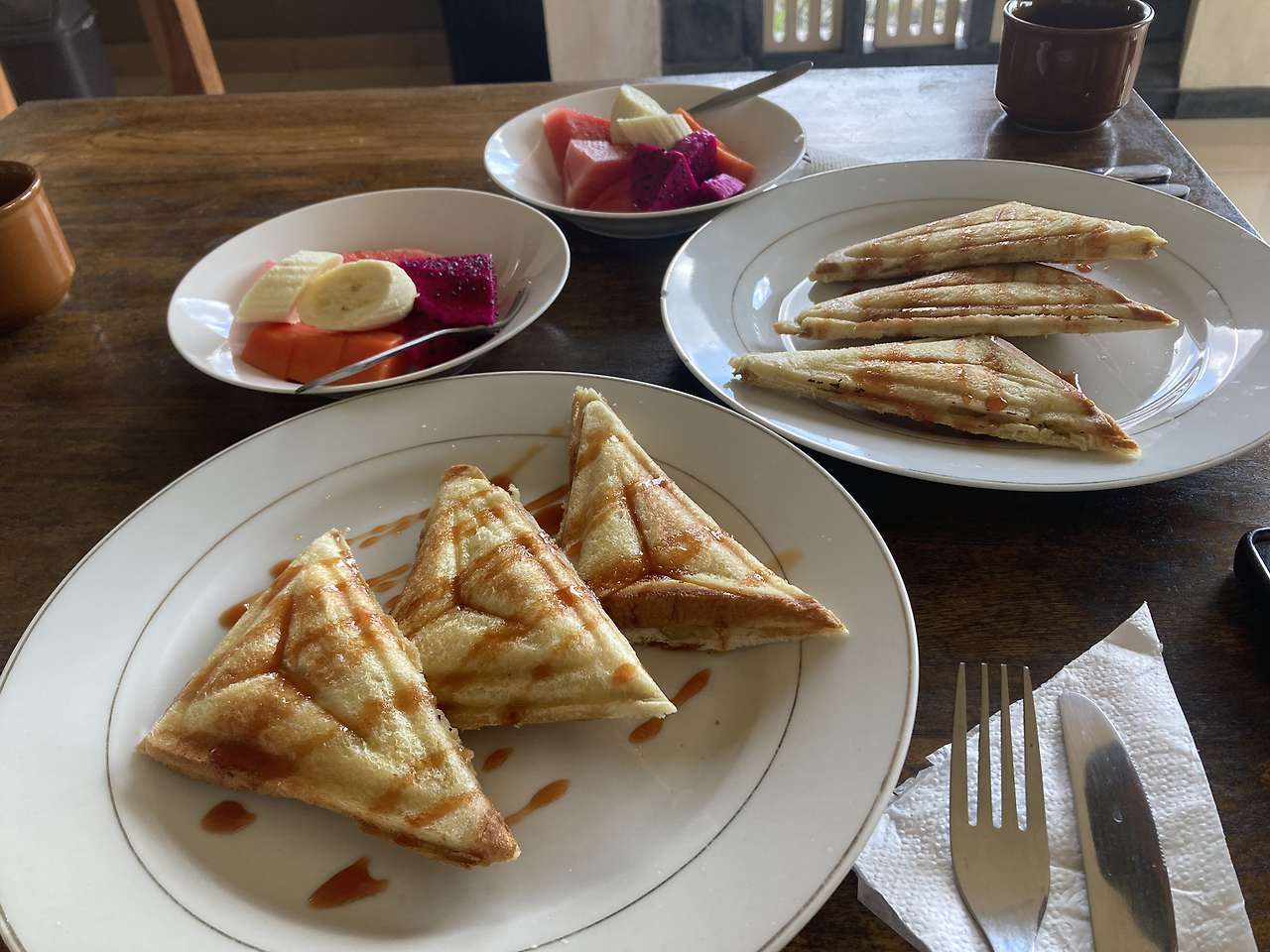딱 한 가지 단점은 화장실이다. 방과 화장실의 분리가 완벽하게 되어있지 않은 구조다. 문은 있지만 천장이 다 뚫려 있어서 소리가 다 들린다. 조금 민망할 수 있다. 하지만 샤워를 하는 동안 심심하지 않게 서로 이야기를 자유롭게 할 수 있다는 장점을 끄집어내어 본다. 에어컨이 없고 작은 개미들이 지나다니기는 하지만 크게 불편할 정도는 아니었다. 동남아를 여행하면서 숙소에서 만나는 작은 개미들은 이제 그냥 숙소의 일부 같다는 느낌이다. 아, 생각해보니 한가지 단점이 더 떠올랐다. 아무래도 시골인지라 닭들이 엄청 울어대는 소리가 크게 들린다. 이상하게 아침 일찍이 아니라 자려고 할때 울더라... 그래도 닭울음소리 때문에 잠을 못자는 일은 없었다.