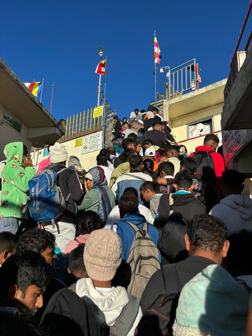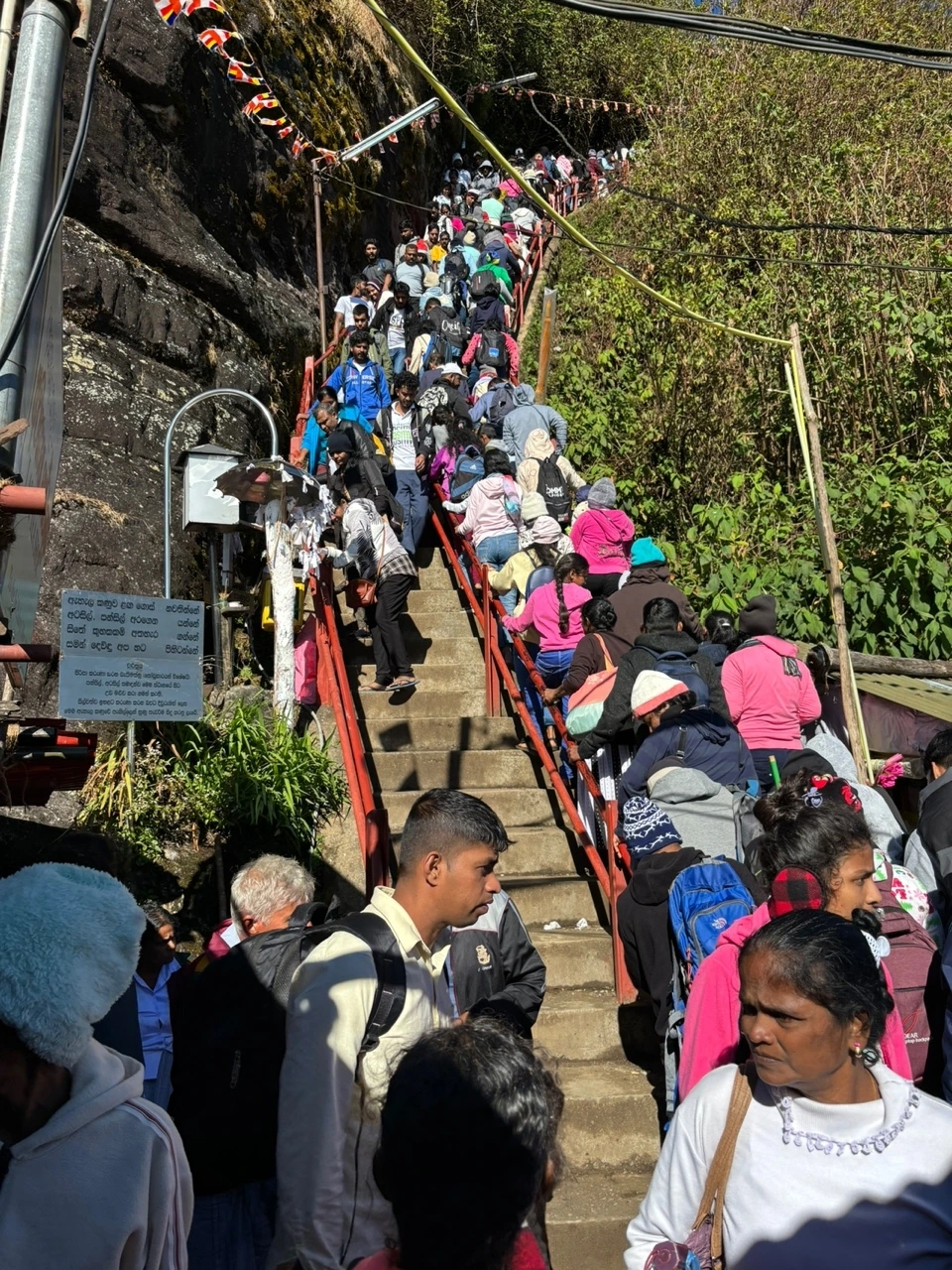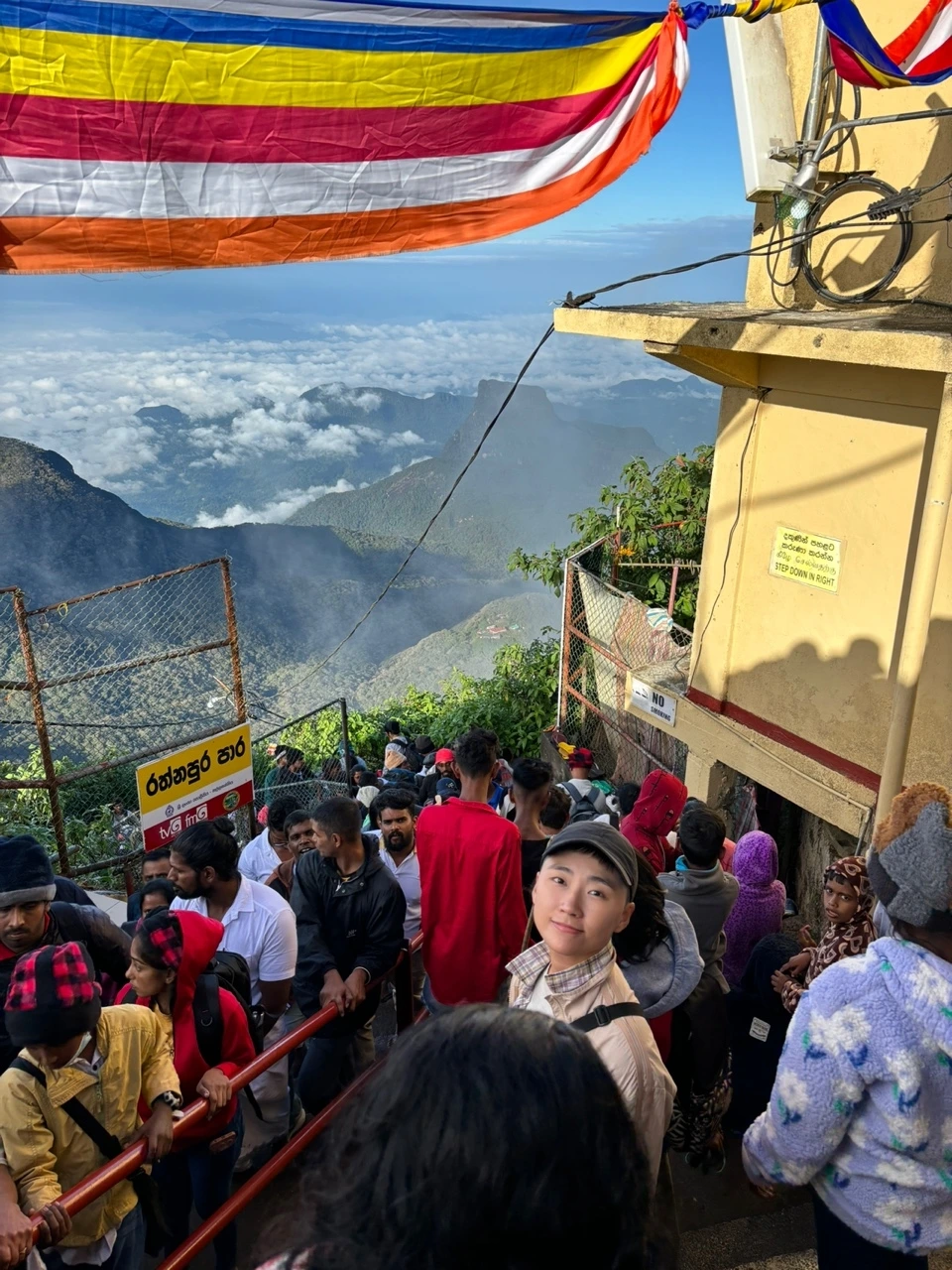 신발과 양말이 젖어 챙겨 왔던 크록스로 바꿔 신었다. 크록스를 신고도 충분히 오를 수 있었다. 비도 조금씩 그치기 시작하고 너무 더워 비옷도 벗어던져버렸다. 가벼운 마음으로 신나게 올랐다. 새벽부터 공복에 유산소운동을 하니 상쾌해지는 기분마저 들었다. 이 좋은 기분은 정상까지 함께 가지 못했다. 우리가 스리 파다를 오른 시기는 스리랑카의 명절이었다. 그리고 이 기간에 정말 많은 스리랑카 사람들이 스리 파다를 오른다. 이 사실을 한국인 여행자가 미리 알기란 어려웠다.