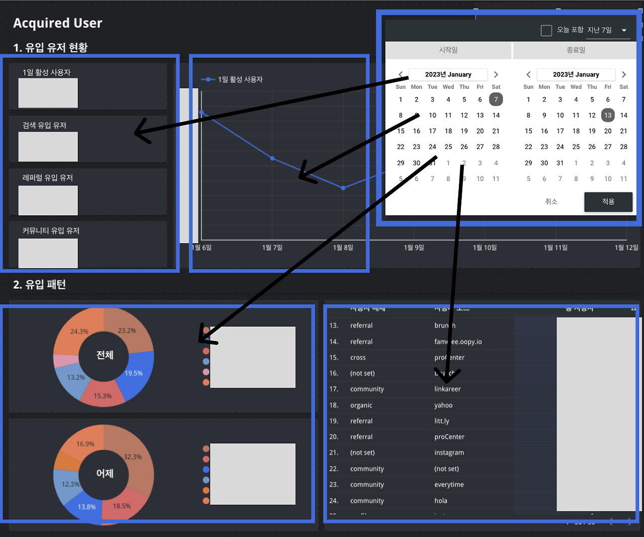 컨트롤러는 현재 페이지의 모든 차트에 영향을 준다. 아래 그림에서 기간 컨트롤러에 설정한 날짜에 따라, 스코어 카드, 선 차트, 도넛 차트, 테이블에서 불러오는 데이터 범위가 결정된다.
