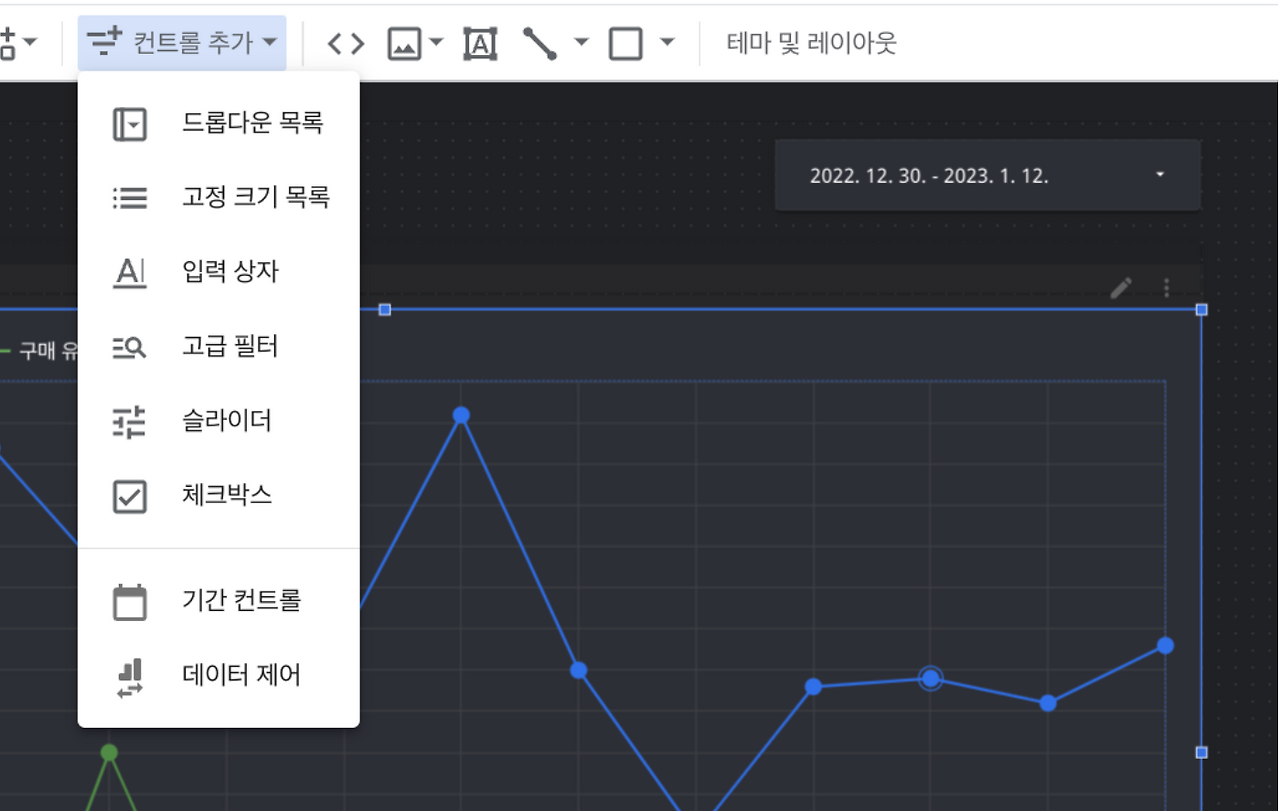 컨트롤러를 추가해 차트에서 보여주는 데이터를 조절할 수 있다. 상단의 [컨트롤 추가]를 클릭하면, 지원 가능한 컨트롤이 추가된다. 해당 컨트롤러는 차트에 연결된 데이터 소스에 필터를 설정한다고 보면 된다. 예를 들어, 아래 그림의 우측 상단에 있는 기간 컨트롤러에 12월 30일부터 1월 12일까지 설정된 걸 볼 수 있다. 이로 인해, 현재 차트에서 불러오는 데이터에 기간 필터가 적용이 된다.