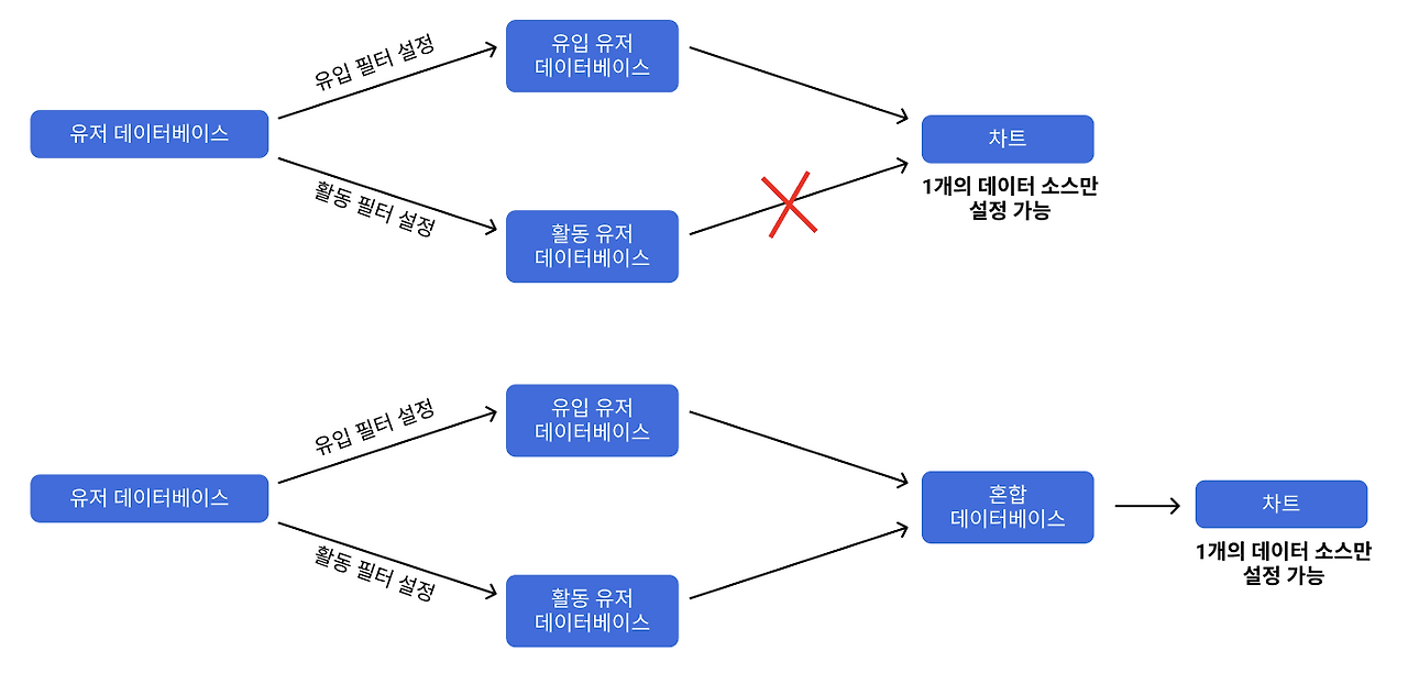 각 퍼널 사이의 전환 데이터를 보기 위해 혼합 소스를 주로 사용한다. 보고서에서 생성한 차트는 1개의 데이터 소스 밖에 연결하지 못한다. 유입 퍼널과 활동 퍼널의 데이터는 서로 다른 데이터 소스에 기반하는데, 이를 1개의 차트에 모두 등록해서 보여줄 수 없다. 이러한 경우, 혼합 소스를 활용해서 차트에 적용한다.
