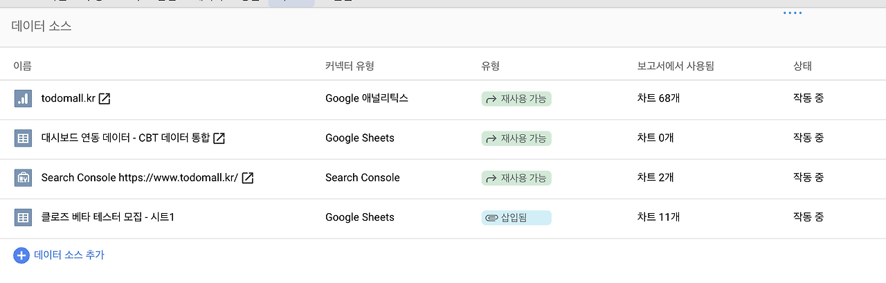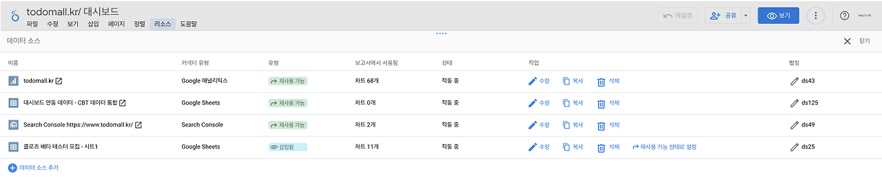 [추가된 데이터 소스 관리]에서 새로운 리소스를 등록하거나, 기존 리소스를 삭제할 수 있다. 아래 그림은 현재 보고서에 적용한 데이터 리소스다. 각 리소스가 보고서의 몇 개의 차트에 사용되는지도 확인할 수 있다.