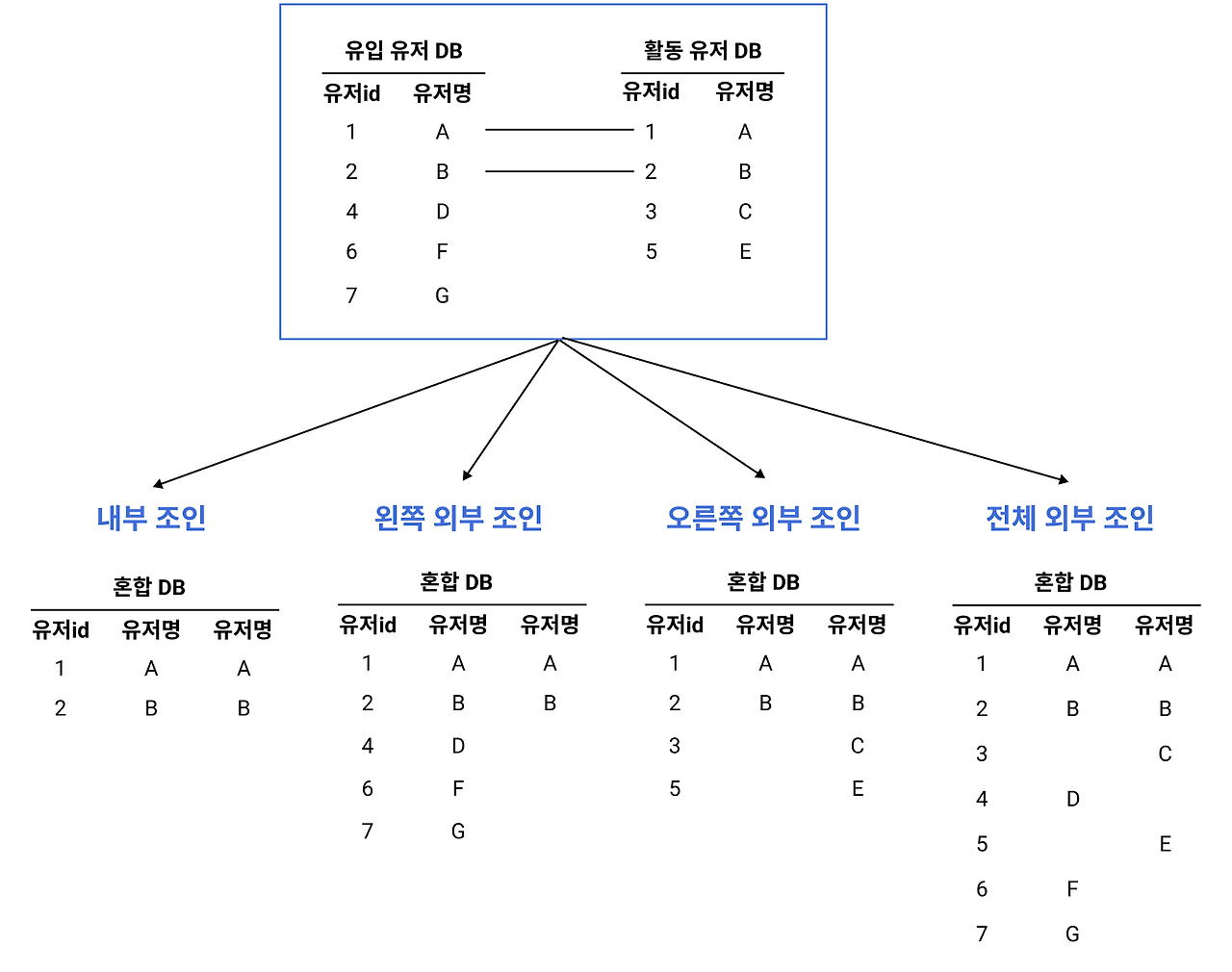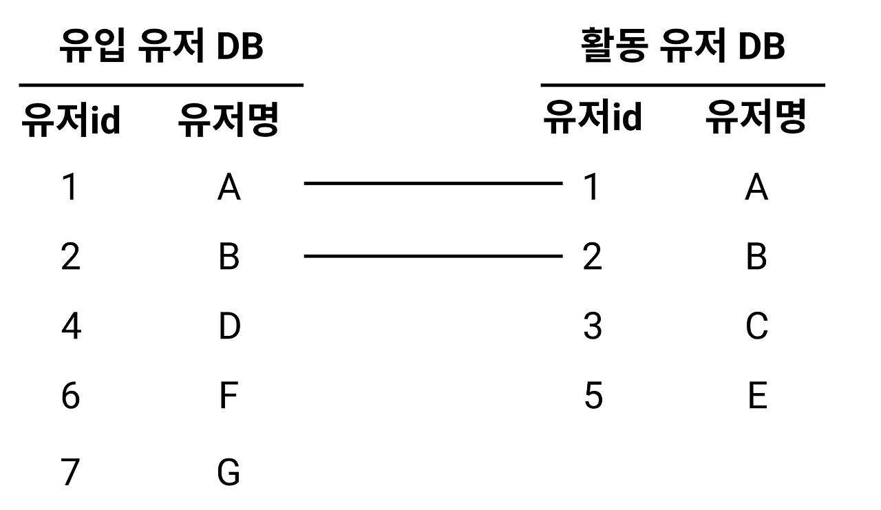 일단, 매칭을 위한 기준 속성 선택 단계부터 봐보자. 서로 다른 데이터베이스를 조인할 때, 어떤 속성값을 기준으로 매칭시킬지 결정해야 한다. 아래 그림처럼 유입 유저 DB와 활동 유저 DB를 혼합한다고 해보자. 이때, 동일한 값을 지닌 유저 id 값을 기준으로 각 데이터베이스의 행을 매칭할 수 있다.