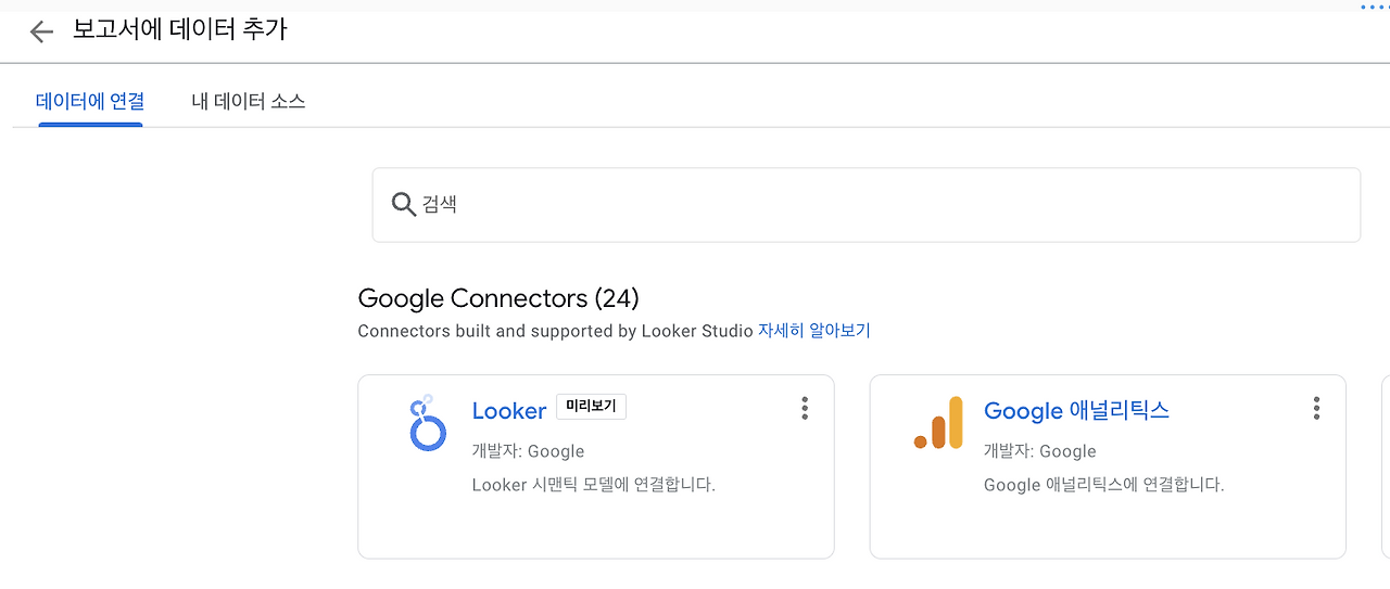 데이터 소스로 스프레드 시트, GA 등 구글의 운영 서비스뿐만 아니라, Postgres, MySQL 등과 연결해 외부 데이터베이스를 불러올 수 있다. 아래는 데이터 소스 탭에서 연결 가능한 외부 서비스다.