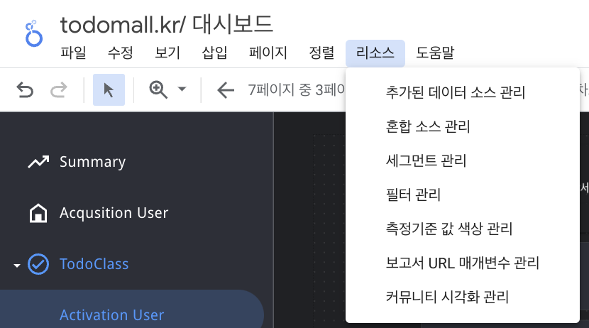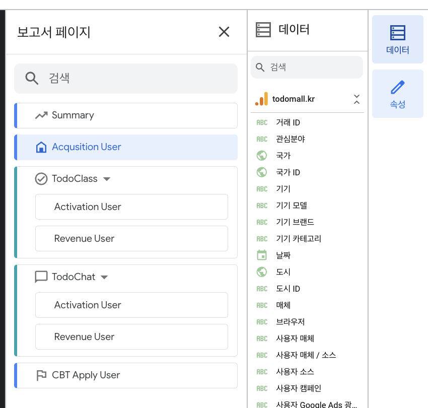 [보고서 페이지] 콘솔창을 보면 (1) 섹션, 혹은 페이지를 생성할 수 있고, (2) 페이지를 특정 섹션 안에 종속시킬 수 있다. 아래 그림을 보면, [TodoClass]라는 섹션 안에 [Activation User]와 [Revenue User]가 있는 걸 볼 수 있다.