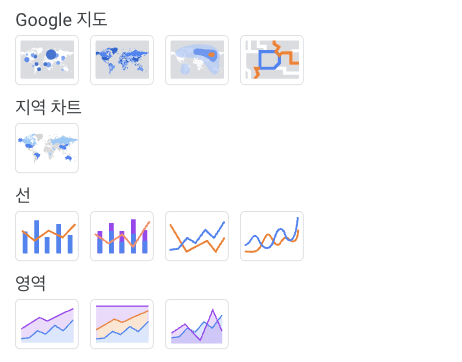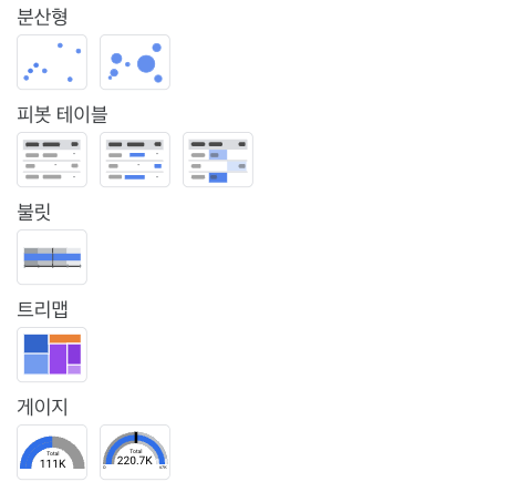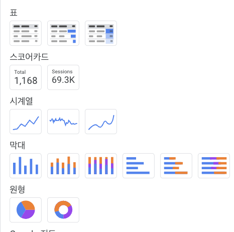 루커 스튜디오에서는 막대, 원, 선, 영역, 트리맵, 분산 그래프와 더불어, 스코어 카드, 표 등 다양한 데이터 시각화를 지원한다.