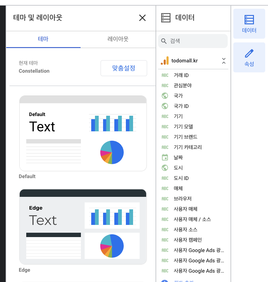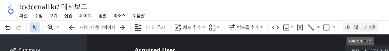 루커 스튜디오에서는 모든 페이지의 레이아웃 및 디자인을 일괄 적용하는 [테마 및 레이아웃] 기능이 있다.