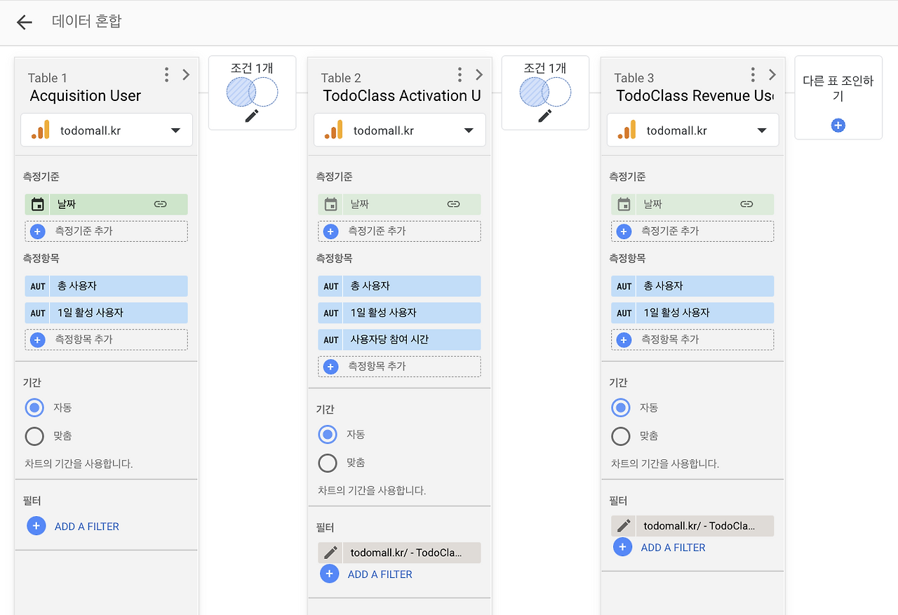 [혼합 소스 관리]에서 등록된 리소스를 합쳐서 새로운 리소스를 만들 수 있다. 아래 그림을 보면, (1) 유입 퍼널, (2) 활동 퍼널과 (3) 구매 퍼널의 데이터를 혼합한 걸 확인할 수 있다.