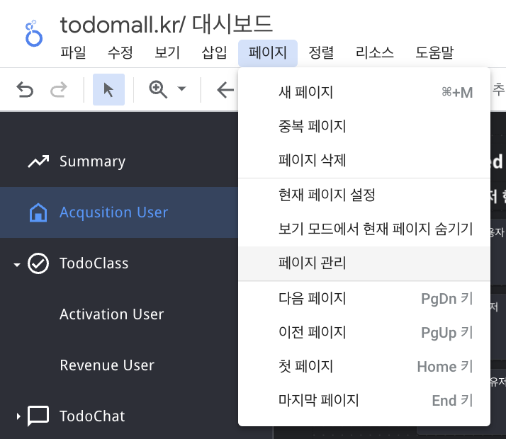 보고서는 여러 페이지로 구성된다. 하나의 페이지에 들어가는 차트가 너무 많거나 혹은, 퍼널 별 차트를 구분하고 싶다면 별도 페이지를 생성하면 좋다. [페이지] 탭의 [페이지 관리]를 클릭하면, 나오는 콘솔창에서 현재 보고서의 페이지를 전반적으로 관리할 수 있다.
