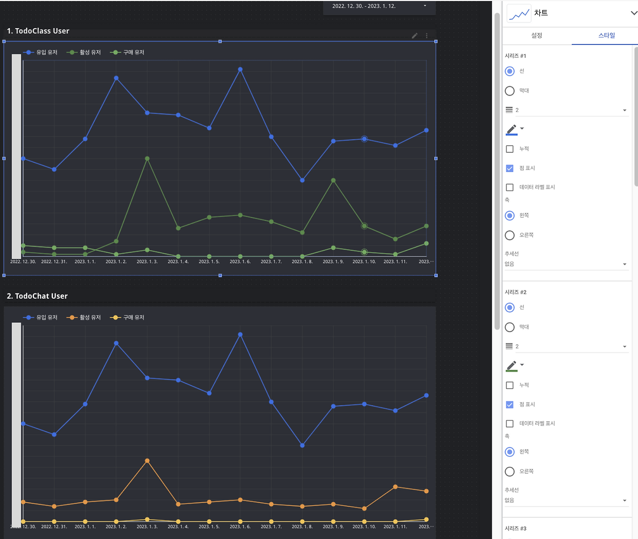[스타일] 탭에서는 현재 차트의 스타일을 직접 적용할 수 있다. 현재 생성한 차트가 막대 차트, 선 차트, 테이블 등에 따라 설정할 수 있는 양식은 다르다. 아래 그림은 서로 다른 유저군을 명확히 분류하기 위해 각 차트의 색을 다르게 했고, 전환을 파악하도록 퍼널 순서에 따라 색조가 달라지는 걸 볼 수 있다. 이처럼 스타일을 어떻게 설정하느냐에 따라서, 차트의 직관성이나 전달 가능한 정보의 양도 달라지니 잘 고민해면서 세팅해 보자.