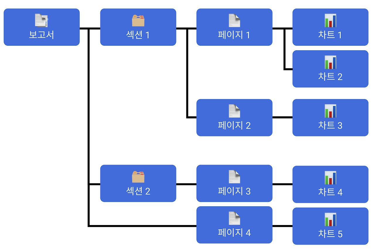보고서는 (1) 섹션 (2) 페이지 (3) 차트순의 트리 구조를 가진다. 섹션은 페이지를 그룹화하는 폴더이고, 페이지는 여러 차트를 위치시킬 대지라고 보면 된다. 섹션은 필수적인 건 아니며, 특정 페이지를 묶어서 봐야 하는 경우에 사용하면 된다.
