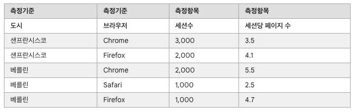 아래 표처럼 측정 기준과 측정 항목을 함께 조합해 데이터를 확인할 수 있고, 측정 기준을 중심으로 측정 항목에 통계 함수를 적용해 통계치를 구할 수 있다. 아래에 브라우저 별 평균 세션 수를 구하고 싶다고 한다면, 브라우저 칼럼을 중심으로 세션 수 칼럼에 평균 함수를 거는 식이다.