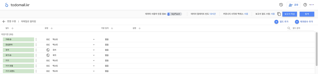 [필터 관리]에서는 현재 보고서에 사용 가능한 필터를 확인할 수 있다. [추가된 데이터 소스 관리]와 마찬가지로, 각 필터가 얼마나 많은 차트에 적용되고 있는지 확인할 수 있다. 여러 차트에 적용 중인 필터라면, 여기서 한 번에 수정이 가능하다.