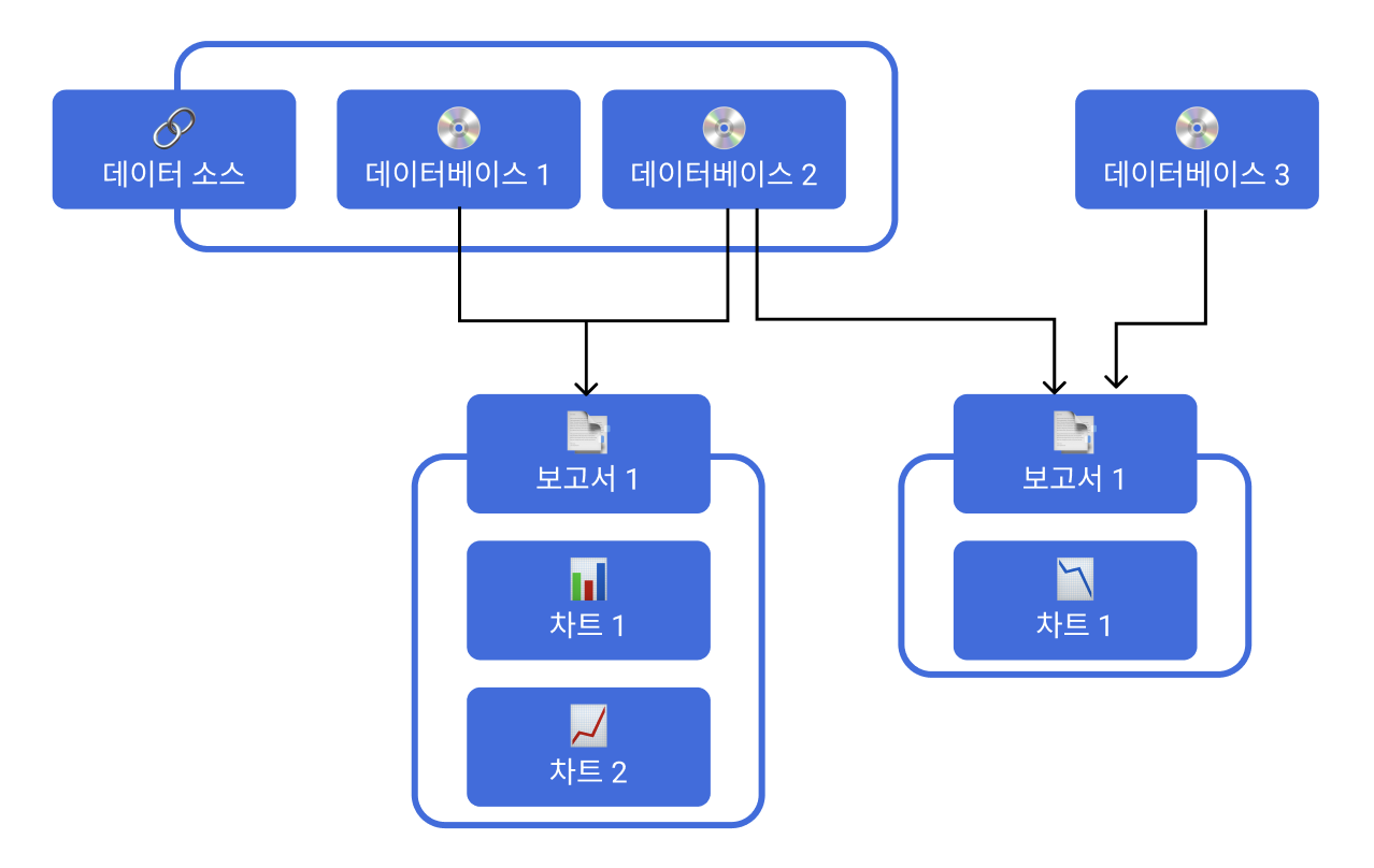 루커 스튜디오에 접속하면 계정에 (1) 보고서와 (2) 데이터 소스를 생성할 수 있다. 보고서와 데이터 소스는 서로 연결되는데, 데이터 소스를 어떻게 관리하느냐에 따라 유지 보수가 확연히 달라진다. 데이터 소스는 루커 스튜디오와 연결해 차트 제작 작업에 사용할 데이터베이스를 뜻한다.
