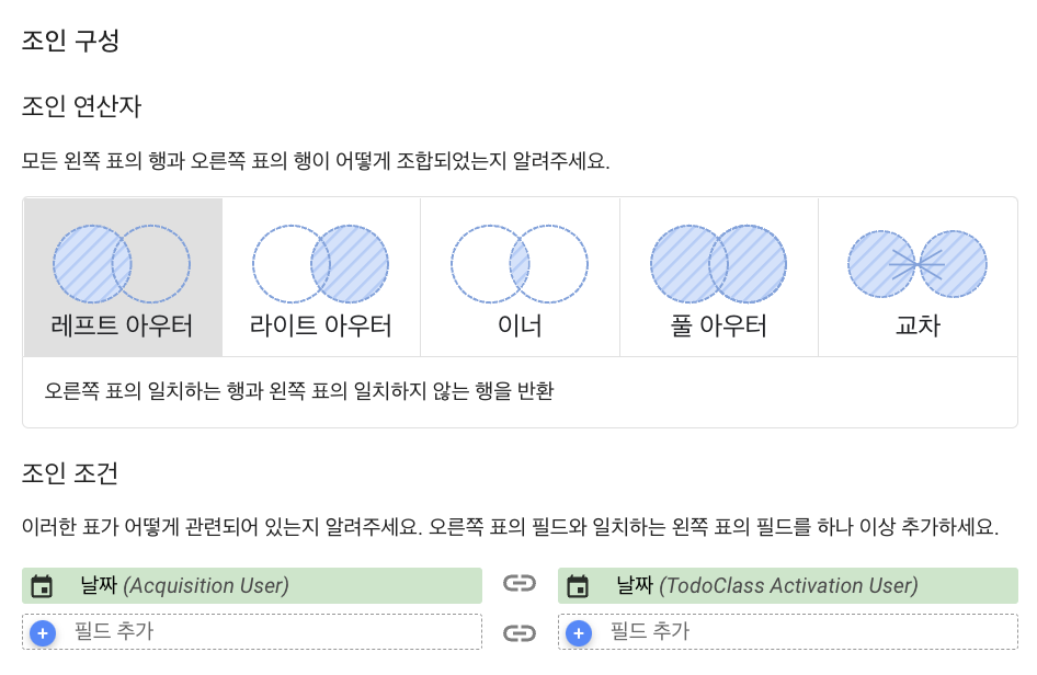 혼합 과정은 크게 (1) 매칭을 위한 기준 속성 선택과 (2) 조인 방식을 선택, 2가지 단계로 구성된다. 아래 그림은 루커 스튜디오에서 혼합 과정을 선택하는 설정창이다. 위쪽에는 조인 방식을, 아래쪽에는 기준 속성을 선택한다.
