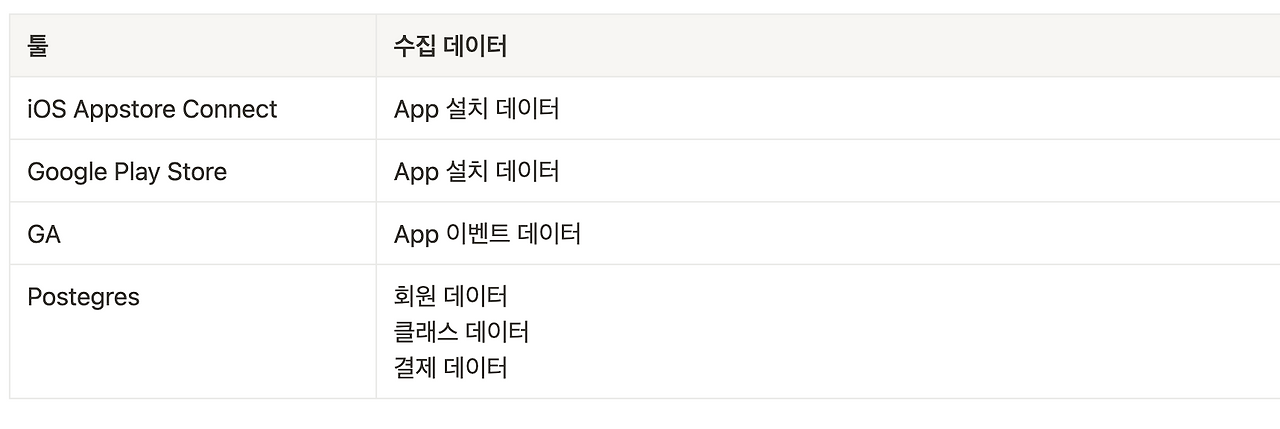 서비스가 나오면, 데이터가 발생하는 곳이 1곳이 아닌 경우가 많다. 앱이라면, 설치 데이터는 iOS나 구글 플레이 스토어의 데이터에서 확인해야 한다. 서비스 내 이벤트는 GA, 엠플리튜드 등을 통해 확인 가능하고, 구매 데이터는 서비스 DB에서 확인 가능하다.