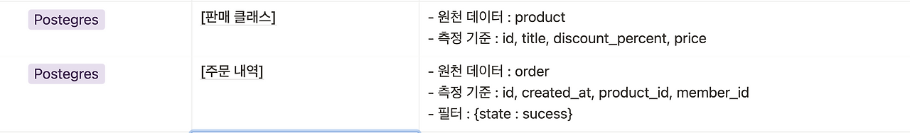테이블을 정의했다면, 이제 어떤 속성을 뽑을지 정의해야 한다. 아마 GA를 공부한 분이라면, 측정 기준과 측정 항목의 차이를 쉽게 이해할 것이다. 해당 속성을 어떻게 집계해서 핵심 지표를 얻을지 생각하면 된다.