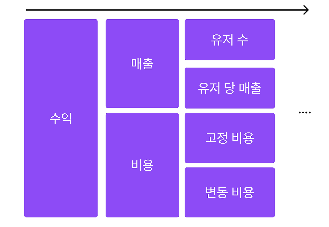 수익을 알기 위해선, 수익을 구성하는 하위 지표에 시선을 돌려야 한다. 수익 지표 자체에 집중을 하면, 해당 수익이 어떠한 부분에서 기회를 얻고 잃는지를 판단할 수 없다. "수익 = 매출 - 비용"이란 간단한 수준에서 끝난다면, 인사이트를 얻기 힘들다. 매출, 비용 각각 어떤 부분에서 크게 발생하는지를 알기 위해서, 이 지표 또한 하위 지표로 구성해야 한다. 지표는 쪼갤수록, 많은 인사이트를 제공한다.