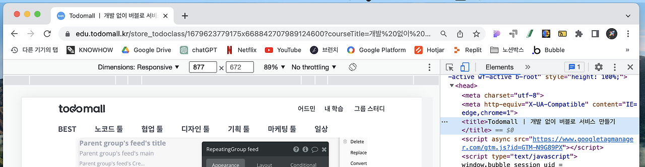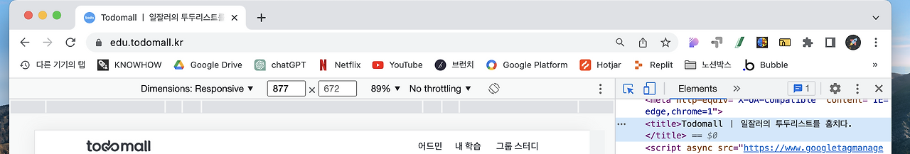 웹사이트는 다양한 웹 페이지로 구성되며, 각 페이지마다 담고 있는 정보가 서로 다르다. 예를 들어, 서비스 소개 페이지는 서비스에 관한 자세한 정보를 담고 있는 반면, 기업 제휴 페이지는 기업 계약 및 프로세스 정보를 담고 있다. 이때, 개별 페이지마다 적합한 정보를 title 값으로 입력하면, 유저는 이동한 페이지마다 어떤 정보를 전달하는지 직관적으로 이해할 수 있다. 아래 이미지는 판매하는 콘텐츠(투두클래스)를 보여주는 페이지다. 브라우저 탭에 "Todomallㅣ개발 없이 서비스 만들기"라고 적힌 걸 볼 수 있는데, 이는 앞선 예시와 다르게 아래처럼 <title> 태그 값을 입력했기 때문이다.