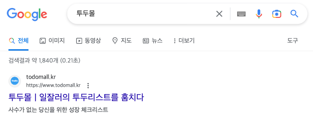 추가적으로, <title>과 <meta name="description">은 검색 포탈 결과 값으로 노출된다. 아래는 구글에서 "투두몰"을 검색했을 때, 나오는 결과 값이다. 이는 HTML에 아래처럼 태그 값을 입력했기 때문이다.