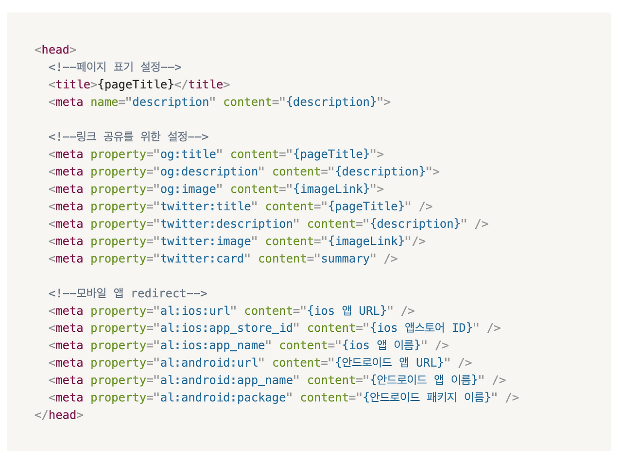 <meta property="al:android:package" content="{안드로이드 패키지 이름}"/>