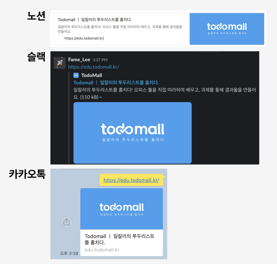우리가 특정 페이지 링크를 공유할 때를 생각해 보자. 채널에 따라 보이는 형태가 다른 걸 알 수 있다. 아래는 노션, 슬랙, 카카오 순으로 edu.todomall.kr 링크를 공유했을 때의 모습이다.