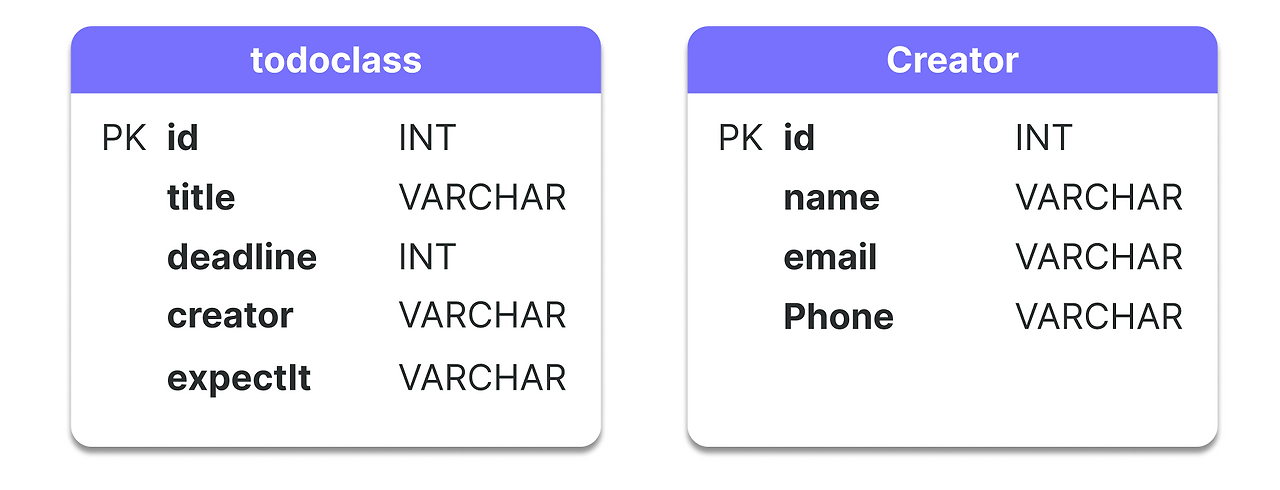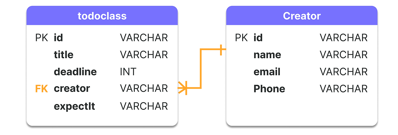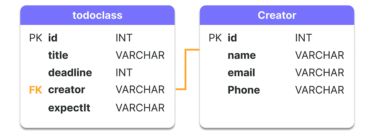 ERD는 어떤 개체가 있는지와 함께, 서로 다른 개체가 어떤 관계를 맺고 있는지도 보여준다. 투두 클래스 개체는 일잘러 개체가 만드는데, 이렇게 서로 다른 개체가 개념적 관계(relationship)를 맺을 경우에 아래처럼 표기한다. todoclass 개체의 creator 속성 옆에 적힌 FK는 외래키(foreign key)로서, 해당 개체가 다른 개체와 연결 됨을 뜻한다. 개체 인스턴스의 FK 값은 연결된 개체 인스턴스의 id 값이 들어간다.