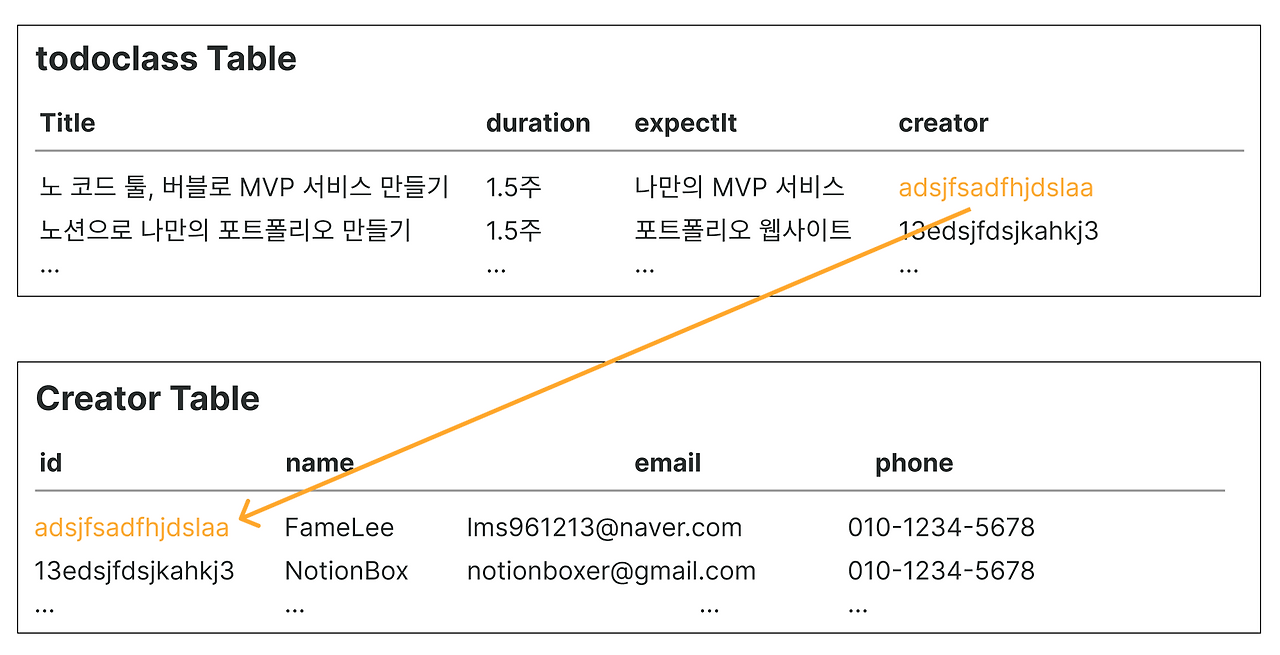 예를 들어, "FameLee"라는 사람의 id가 "dddsdfsdf33"이고, "노 코드 툴, 버블로 MVP 서비스 만들기"라는 클래스를 만들었다고 해보자. 그러면, 해당 투두 클래스 개체 인스턴스가 지닌 creator 속성은 연결된 일잘러 개체의 id인 "dddsdfsdf33"가 입력된다.