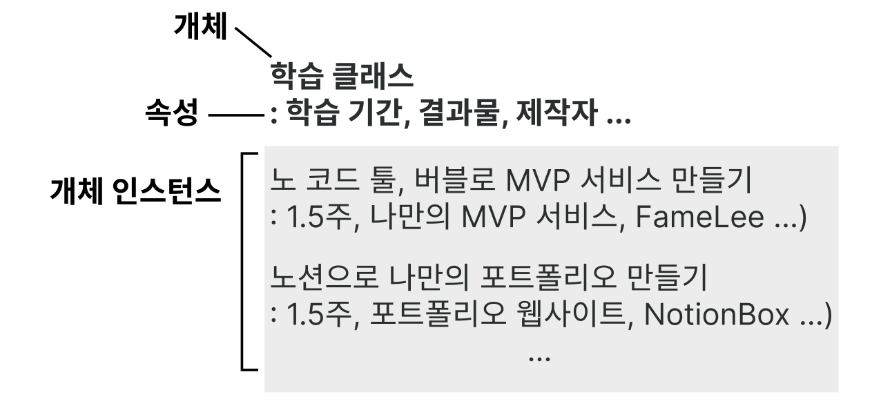 투두 클래스로 "노 코드 툴, 버블로 MVP 서비스 만들기"와 "노션으로 나만의 포트폴리오 만들기"가 있는데, 이렇게 개체 내 실체를 개체 인스턴스(Entity Instance)라고 칭한다. "노 코드 툴, 버블로 MVP 서비스 만들기" 클래스는 1.5주 정도의 학습 기간을 지니며, 따라 하면 MVP 서비스를 최종 결과물로 만들 수 있다. 따라서, 해당 개체 인스턴스의 속성은 {학습 기간 : 1.5주}, {따라 하면 완성되는 결과물 : MVP 서비스}가 된다.