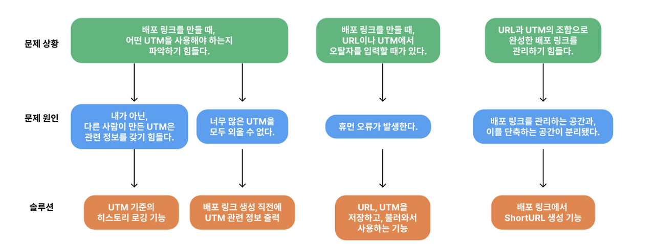 배포 링크를 만들 때, 매번 URL과 UTM을 직접 입력하는 과정에서 문제가 발생합니다. 따라서, 매번 입력하는 게 아니라, UTM 값을 처음에 저장하고 필요할 때마다 불러와서 사용하면 해결할 수 있습니다.