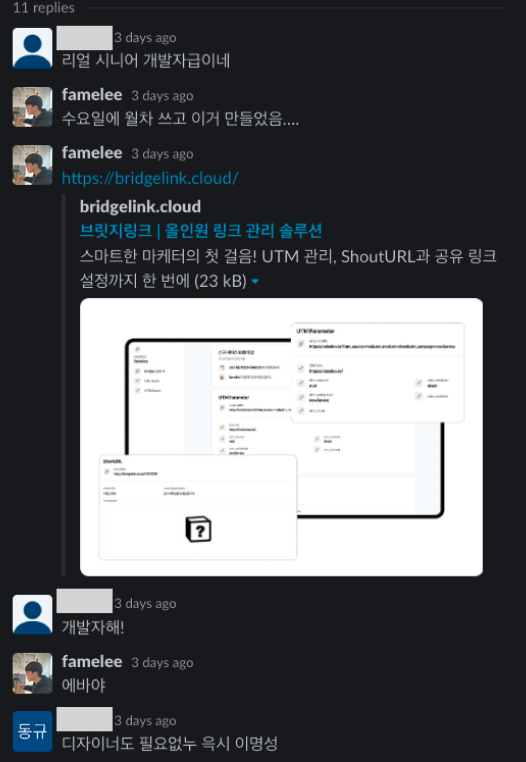 다만, 기존의 관리 방식은 (1) UTM 히스토리 로깅이 힘들고, (2) 여러 명이 함께 사용하는 경우에 자칫 불필요하거나 중복되는 UTM을 생성하는 등의 문제가 있습니다. 이러한 문제를 해결할 수 있는 서비스를 만들면 좋겠다는 생각에서 브릿지링크를 시작했습니다.