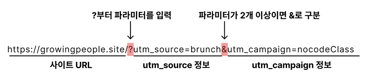 예를 들어 https://growingpeople.site/?utm_source=brunch&utm_campaign=nocodeClass 라고 한다면, 데이터 트래킹 툴은 (1) 유입 소스가 “brunch”고, (2) 광고 캠페인 이름이 “nocodeClass”인 걸 인식합니다.