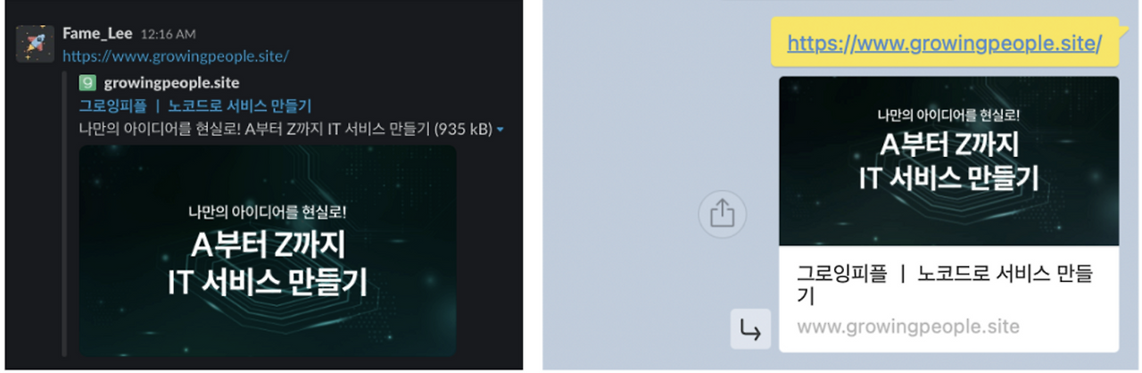 배너, 이미지, 영상 광고의 경우, 잠재 유저는 눈에 보이는 광고물을 클릭하고, 연결된 UTM 배포 링크로 접속하게 됩니다. 즉, 링크와 광고물이 일체 된 상태로 존재하며, 이러한 경우에 클릭률은 어떠한 광고물을 쓰느냐에 의해 결정됩니다. 하지만, 단톡방이나 커뮤니티에서는 링크와 광고물이 동시에 존재할 수 없습니다. 링크를 올리면, 자동으로 해당 링크와 연결된 웹사이트의 타이틀, 썸네일이 아래처럼 보이게 됩니다.