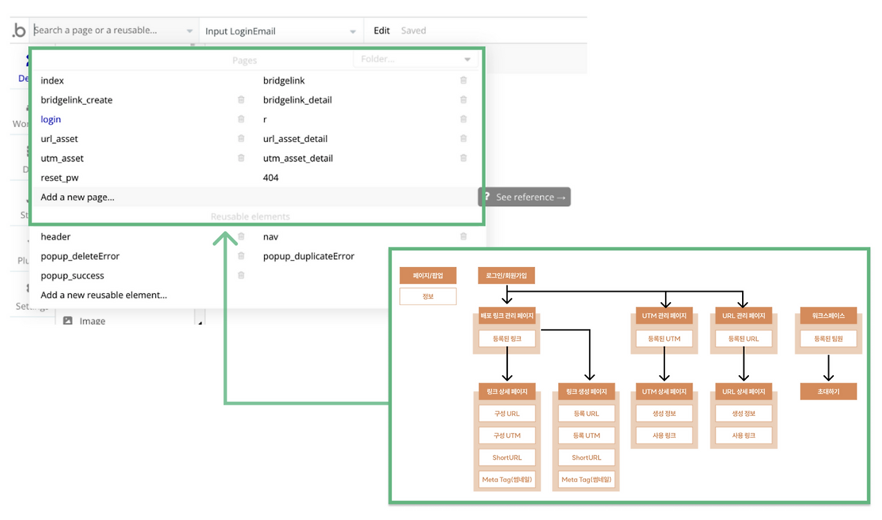 그다음으로 작업한 UI 작업물에 따라 개별 페이지에 필요한 요소를 생성해 배치했습니다. 버블의 프론트엔드 작업은 (1) 클릭과 (2) 드래그 앤 드랍으로 끝이 납니다. 요소 생성 창에서 인풋 필드, 텍스트 필드 등을 클릭해 페이지 안으로 드래그하면, 페이지 안에서 바로 생성됩니다.