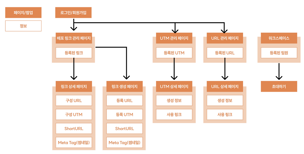 ‘한 곳에서 끝내는 링크 관리’로 포지셔닝한 이상, 서비스가 링크 관리에 필요한 업무를 일련의 흐름에 따라 처리하할 수 있도록 도와줘야 했습니다. 서비스의 플로우 차트(Flow Chart)를 직접 그려보며, 유저의 링크 관리 업무를 어떤 흐름으로 가지고 가야 할지 스케치했습니다.