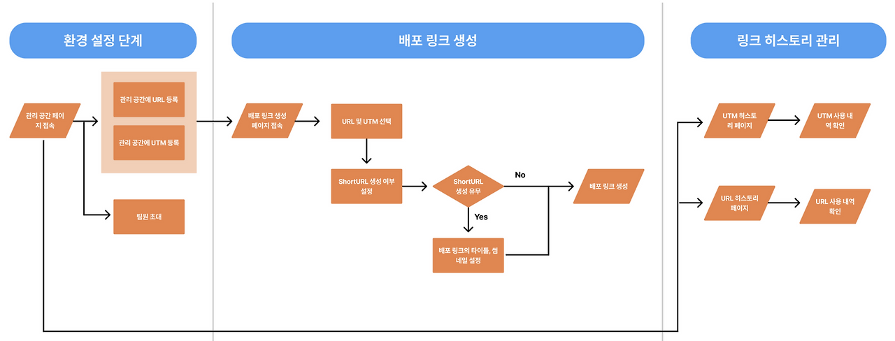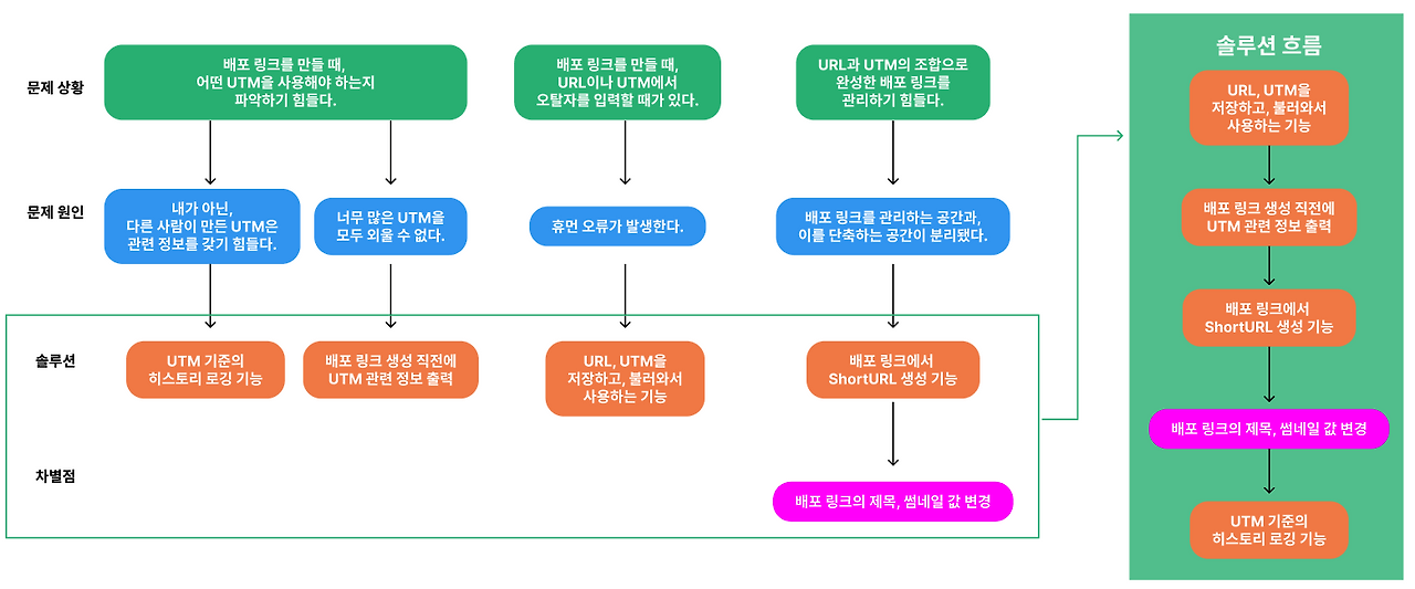 도출한 솔루션 방향을 확인해 보니, 마케터의 링크 관리 업무의 시작부터 끝까지를 다루고 있습니다. (1) 관리 공간에서 UTM과 URL을 등록하고, (2) 이를 불러와서 배포 링크를 생성하고 (3) 제목, 썸네일을 따로 변경해 ShortURL을 만드는 흐름이 그려집니다.
