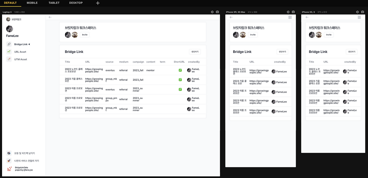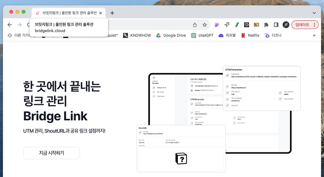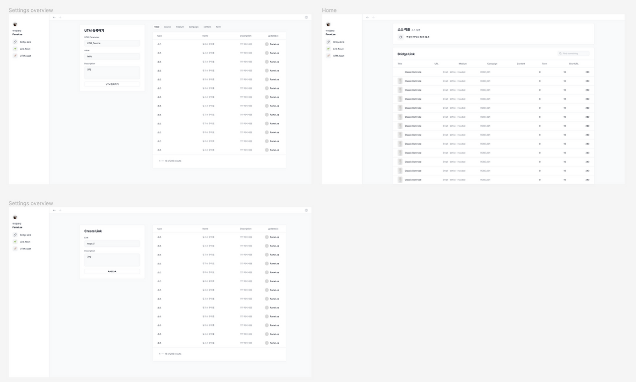 이 흐름에 착안해 서비스 컨셉을 “올인원 링크 관리 솔루션”으로, 캐치프레이즈를 “한 곳에서 끝내는 링크 관리”로 잡았습니다. 그리고, 다양한 링크를 연결한다는 의미로 “브릿지링크”를 서비스명으로 설정했습니다.