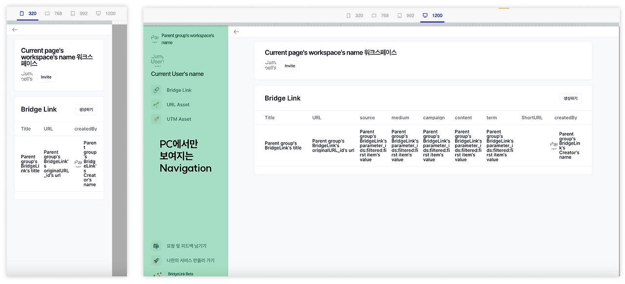 PC의 넓은 화면에 담을 수 있지만, Mobile의 작은 화면에서 담길 수 없는 요소들도 있습니다. 예를 들어, 네비게이션은 PC에서 좌측에 고정 상태로 있지만, Mobile에서는 크기로 인해 보여주기 어렵습니다. 이렇게 디바이스에 따라서 다르게 보여줘야 하는 요소들은 출력 처리에 조건을 걸었습니다.