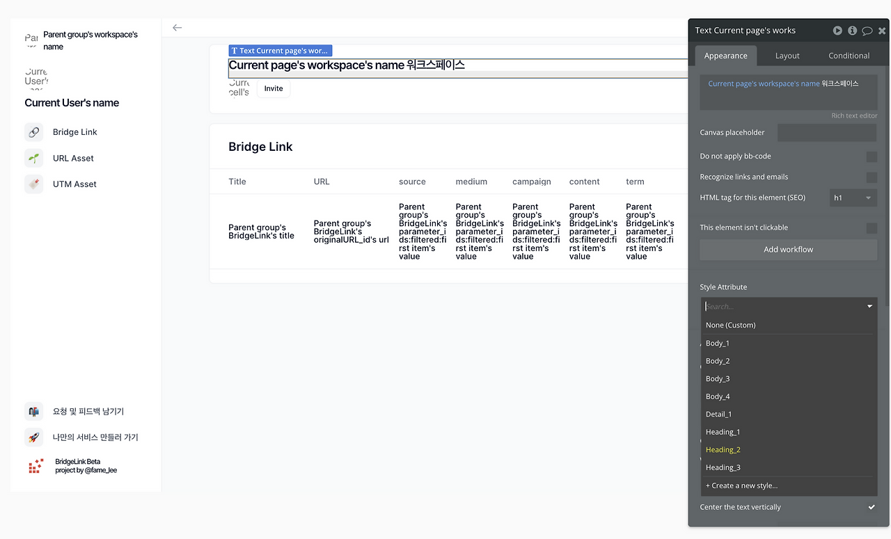 버블은 자유도가 높은 만큼, 서비스를 만드는 데 오랜 시간이 걸립니다. 페이지와 컴포넌트마다 스타일 값, 마진, 패딩 등을 하나하나 설정해줘야 하기 때문입니다. 다만, 버블의 디자인 시스템 기능을 활용하면, 작업 시간을 기하급수적으로 단축시킬 수 있습니다. 서비스 개발에 드는 시간을 줄이기 위하 디자인 시스템기능을 적극적으로 활용했습니다.