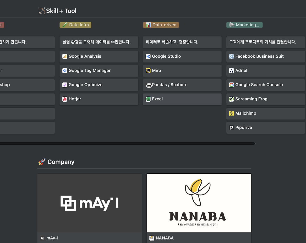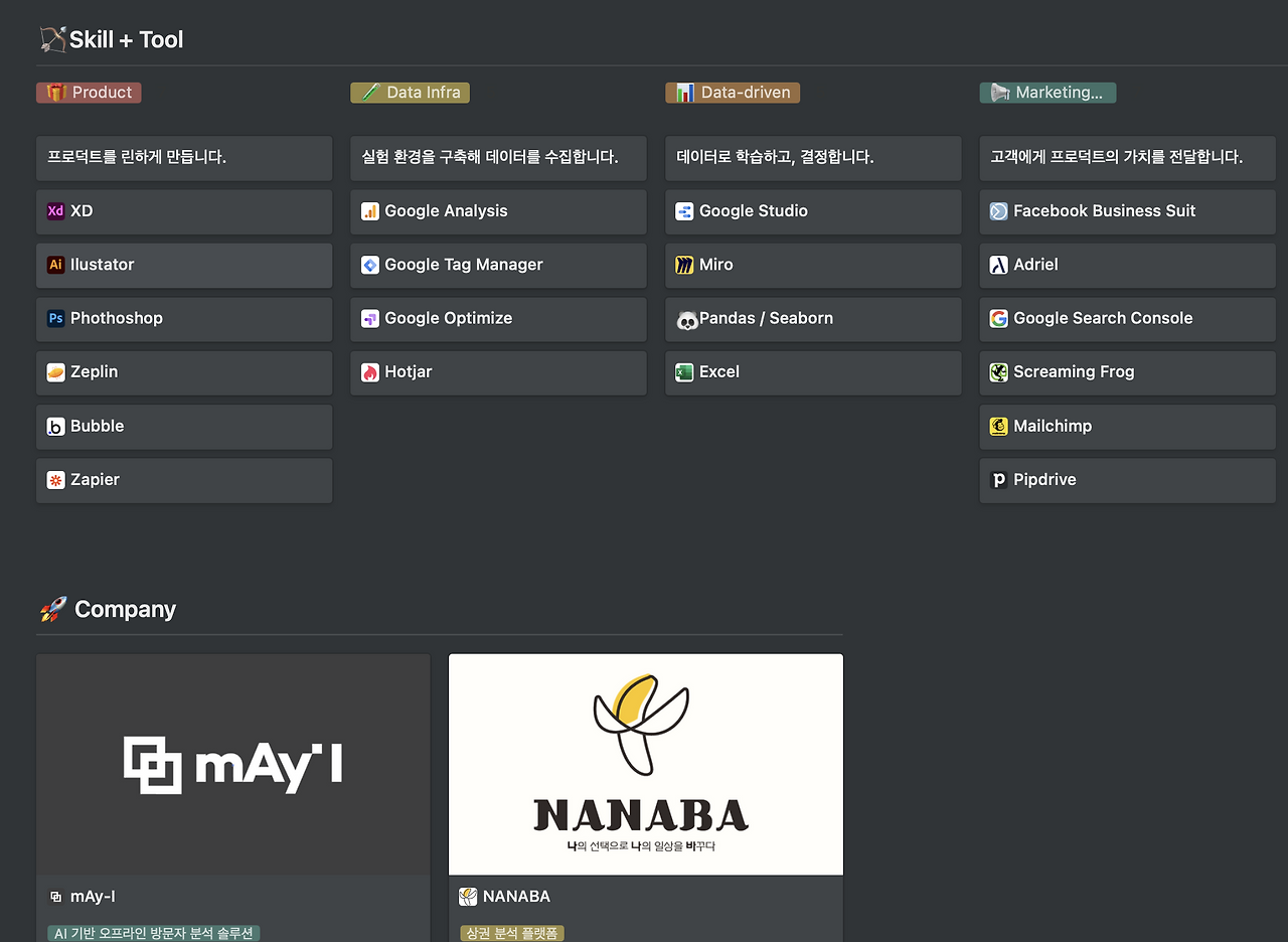 포트폴리오의 목적은 결국 '나'란 사람이 어떤 능력을 갖고 있는지 보여주는 데 있다. 따라서, 능력을 보여주는 정보가 가장 높은 우선 순위가 되야 한다. [Skill + Tool 섹션]에서는 내가 다룰 수 있는 툴을 요악해서 보여준다. 이때, 단순히 '이런 툴을 사용할 수 있다.'보다, '이 업무를 위해, 이런 툴을 활용할 수 있다.'를 전달할 수 있도록 구성했다.