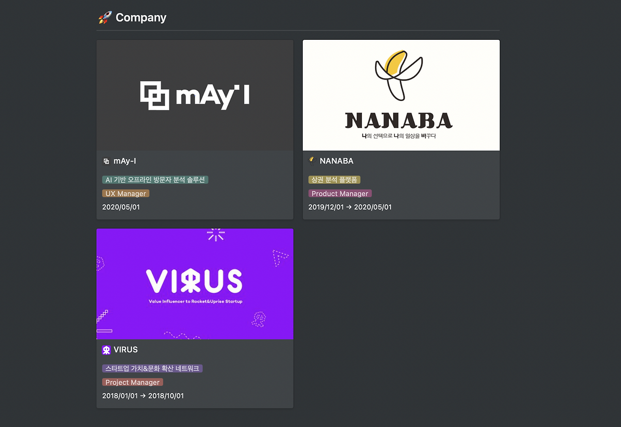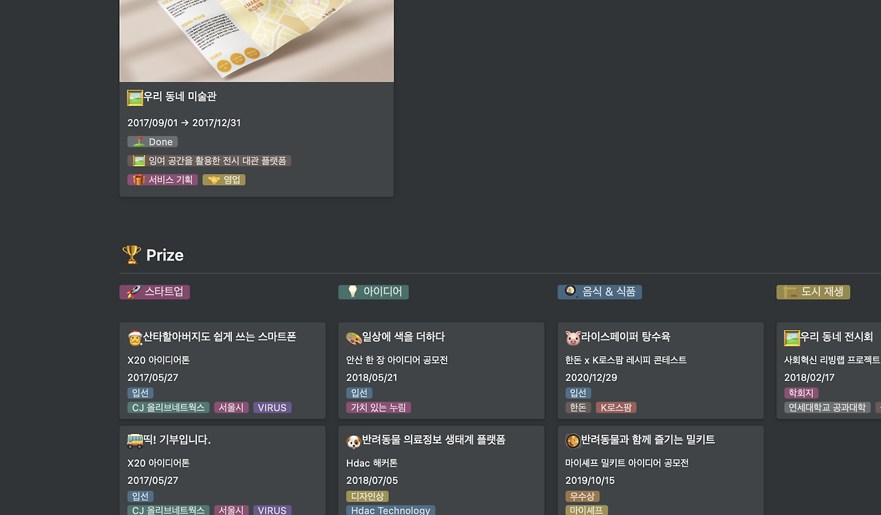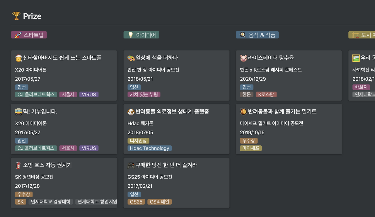 마지막엔 [Prize 섹션]을 위치시켰다. 아직은 학생 신분...! [Prize 섹션]은 내 경험과 능력을 앞선 섹션의 수준으로 전달하기 어렵다고 판단해 일부로 비중을 적게 가져갔다. 정보의 위계질서를 나누고자 [Company 섹션], [Side Project 섹션]은 Galley View를 사용한 반면에, [Company 섹션]은 Board view를 사용했다. 또한, 한 번 훑고 넘어가는데 충분하도록 수상 실적, 주최 기관 등 관련 정보를 Board에 직접 노출시켰다.